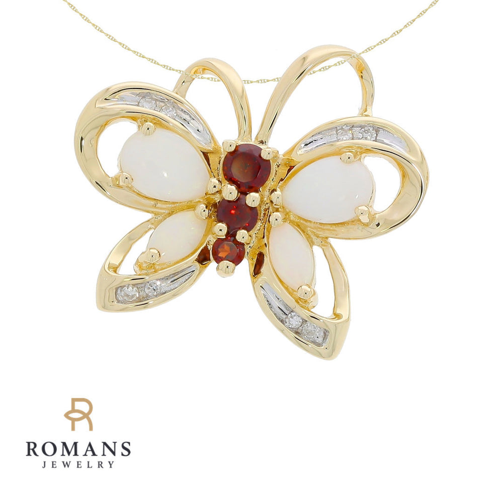 This butterfly pendant is an excellent choice. Crafted in bright 14k yellow gold, this pendant features opals surrounded by a sparkling diamonds with garnets in the center. The petite size makes this a great everyday jewelry option. CHAIN SOLD SEPARATELY