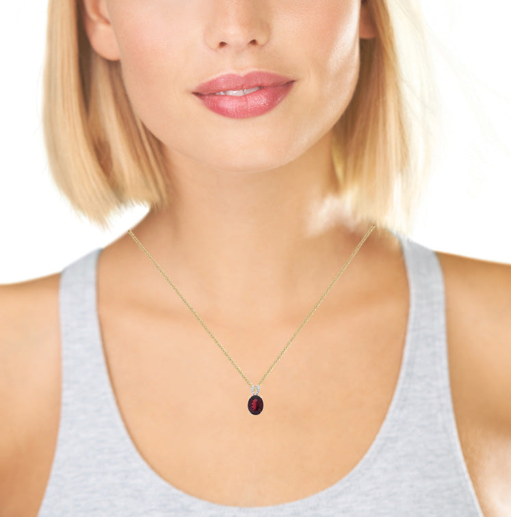 This deep garnet and diamond pendant is an excellent choice. Crafted in bright 14k yellow gold, this gemstone pendant features an oval garnet with a diamond-accented bail. The size makes this a great everyday jewelry option. CHAIN SOLD SEPARATELY