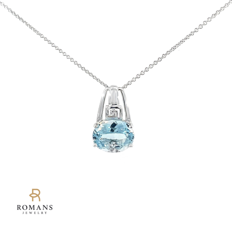 This elegant pendant features an oval aquamarine, set in a simple greek key style design, crafted in 14K white gold. The pendant perfectly showcases the beautiful light blue hue of the aquamarine. The clean, timeless design makes this pendant a versatile and stylish addition to any jewelry collection. CHAIN SOLD SEPARATELY.