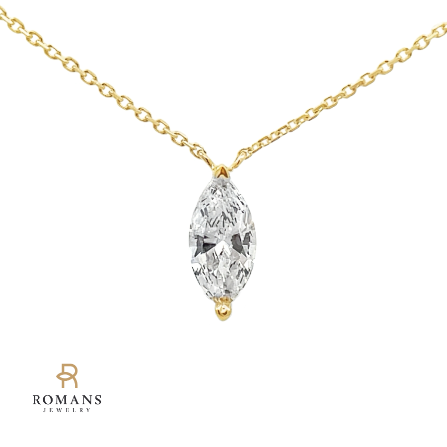 A beautiful marquise cut diamond is set in a 2-prong basket in this elegant style fixed along a lustrous 14k yellow gold cable chain. The necklace can be worn at 18" perfect for layering. Diamond 0.47-carat weight,  SI1 clarity H color.