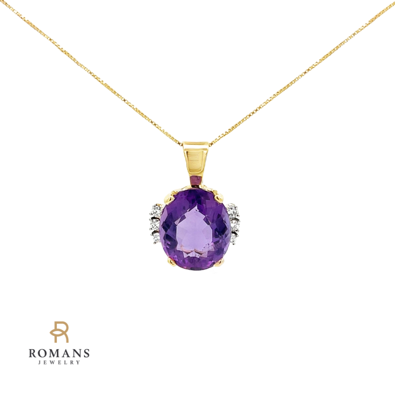 This elegant pendant features a stunning oval-cut amethyst set in 14K yellow gold. On each side of the vibrant purple gemstone are three sparkling diamonds, adding a touch of brilliance and sophistication. A timeless piece perfect for any occasion.