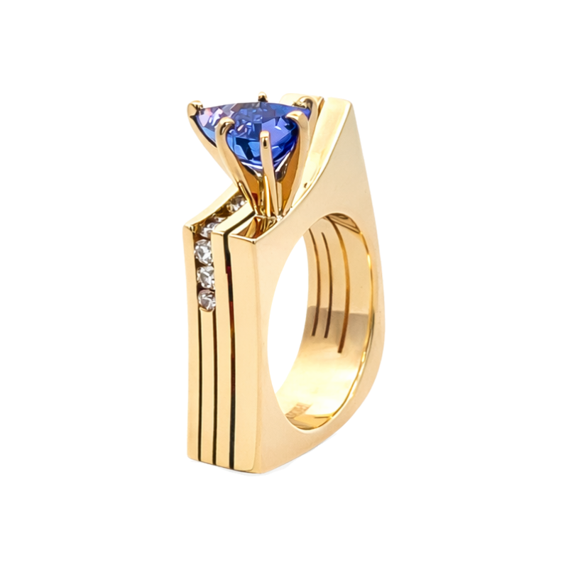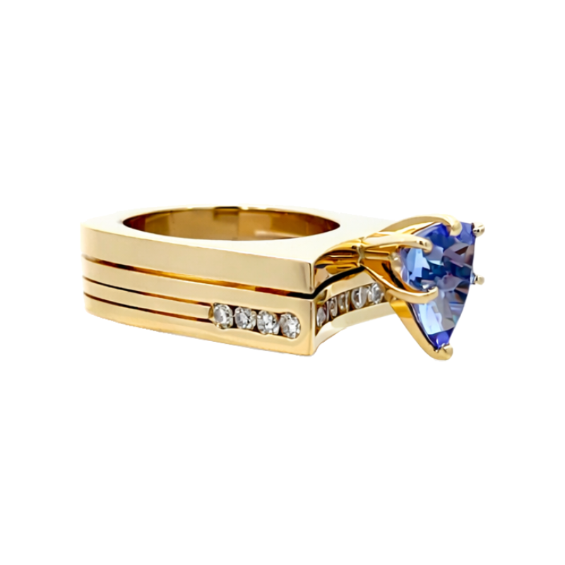 This striking pear-shaped tanzanite and diamond ring is crafted in rich 14K yellow gold, featuring a vivid blue-violet tanzanite set in a classic prong setting. Sparkling diamond accents are channel-set along the shoulders, adding brilliance and a sleek, modern edge to the design. The elongated pear shape creates an elegant, flattering silhouette, while the bold contrast of tanzanite, diamonds, and yellow gold makes this ring a true statement piece. Perfect as a fashion ring, anniversary gift, or unique gemstone addition to a fine jewelry collection.