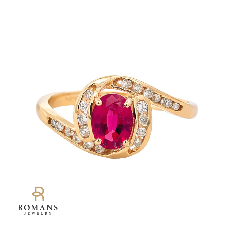 This elegant ring features a rich oval cut rubellite tourmaline at the center, framed by a sparkling diamond halo that enhances its vibrant color. Crafted in 14K yellow gold, the design is completed with diamond accents along the shank, adding refined brilliance and a smooth, sophisticated finish.