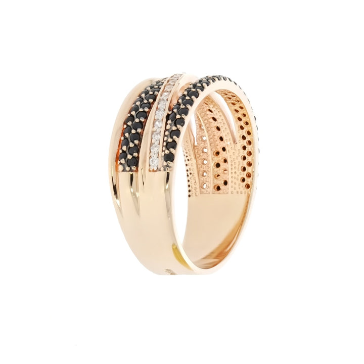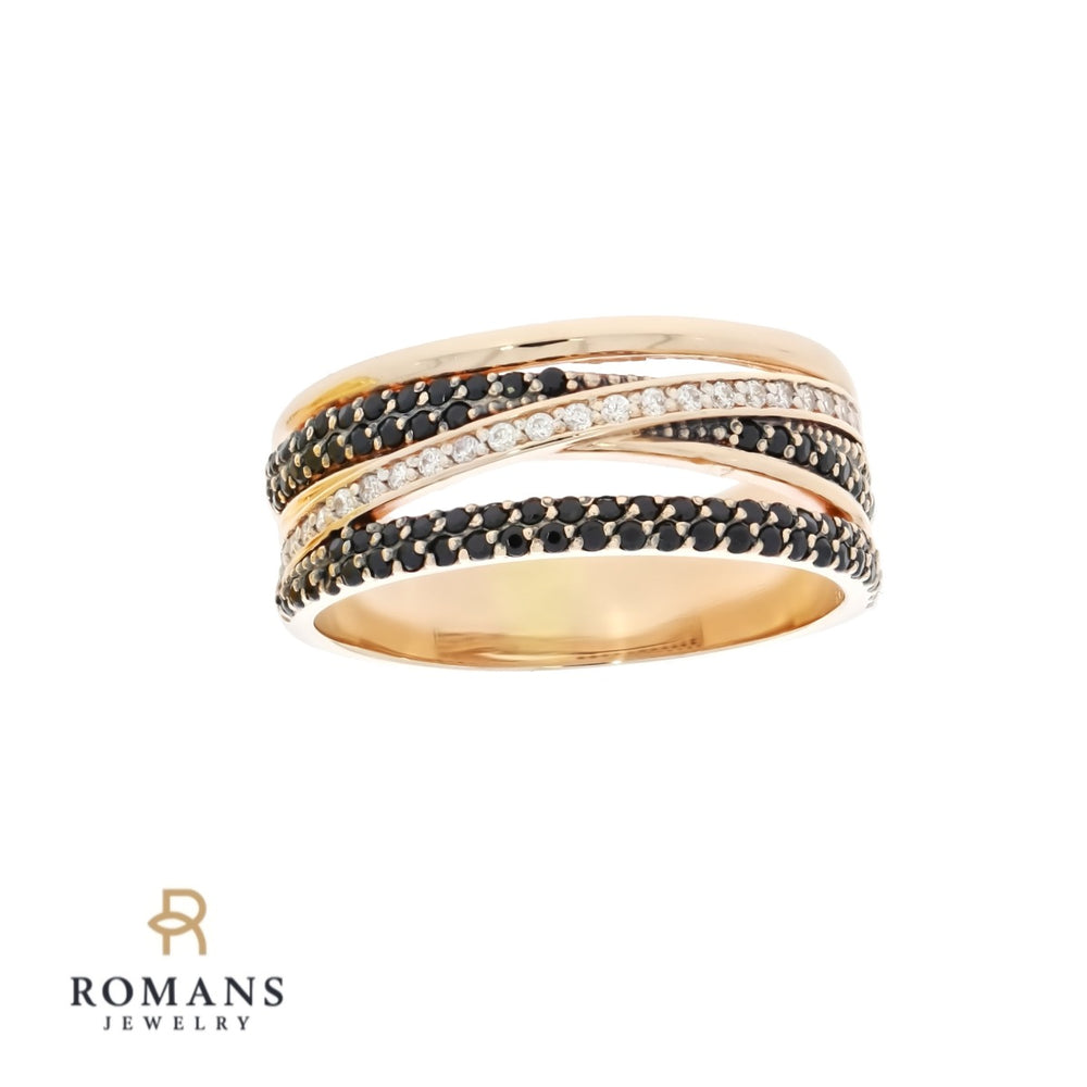 Crafted from 14k rose gold, this cubic zirconia band is a style essential. Multiple rows of sparkling round black and white cubic zirconia's shimmers brightly half way down the shank.