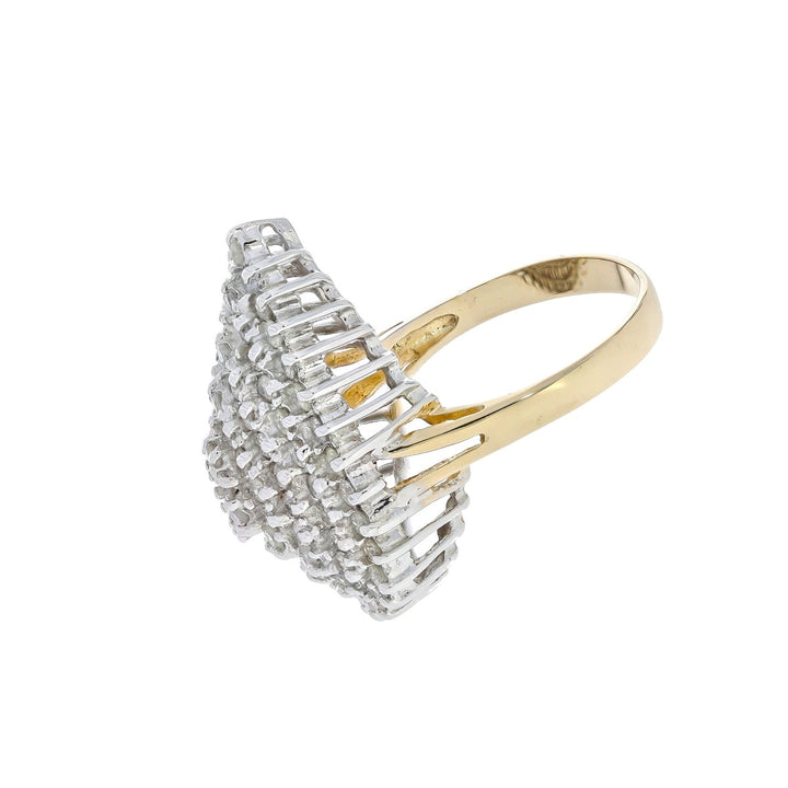 In a breathtaking modern design,  cut diamond accents are arranged in a stunning pear shaped cluster. A raised gallery adds a regal quality to this illustrious 14k two tone gold beauty. Final Sale, No Returnable or Exchange.