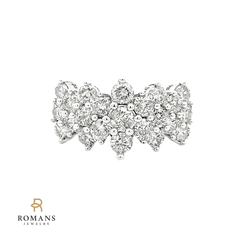 This magnificent cluster diamond ring is uniquely captivating. The 14K white & yellow gold ring boasts stunning round diamonds encompassed by a fiery round diamond accents with diamonds, adding fascinating contemporary flair.