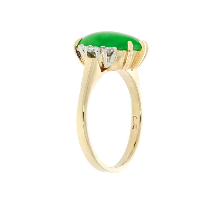 The mesmerizing deep green oval shaped natural jadeite jade double cabochon takes center stage in this sensational 14K yellow gold ring. Exquisite detailing around the ring that is accompanied by beautiful diamonds dazzle framing the center gem enhances the luxury shaped jade cabochon.