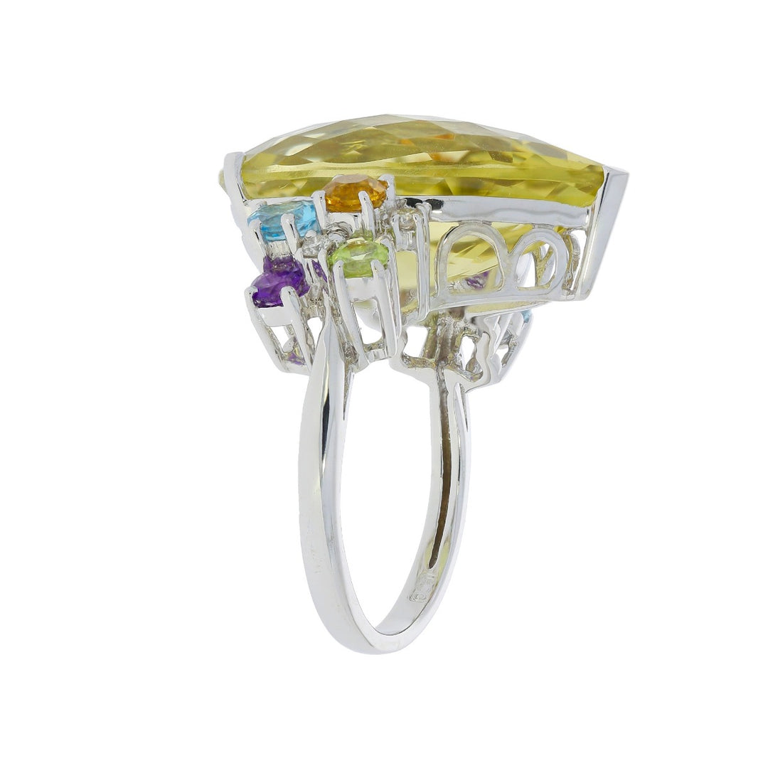 This unique and captivating ring features a pear shaped lemon quartz enhanced by clusters of round cut amethysts, aquamarine, citrine, peridot, topaz and diamonds. Set in lustrous 14k white gold this gemstone ring is playful and perfect for any occasion.