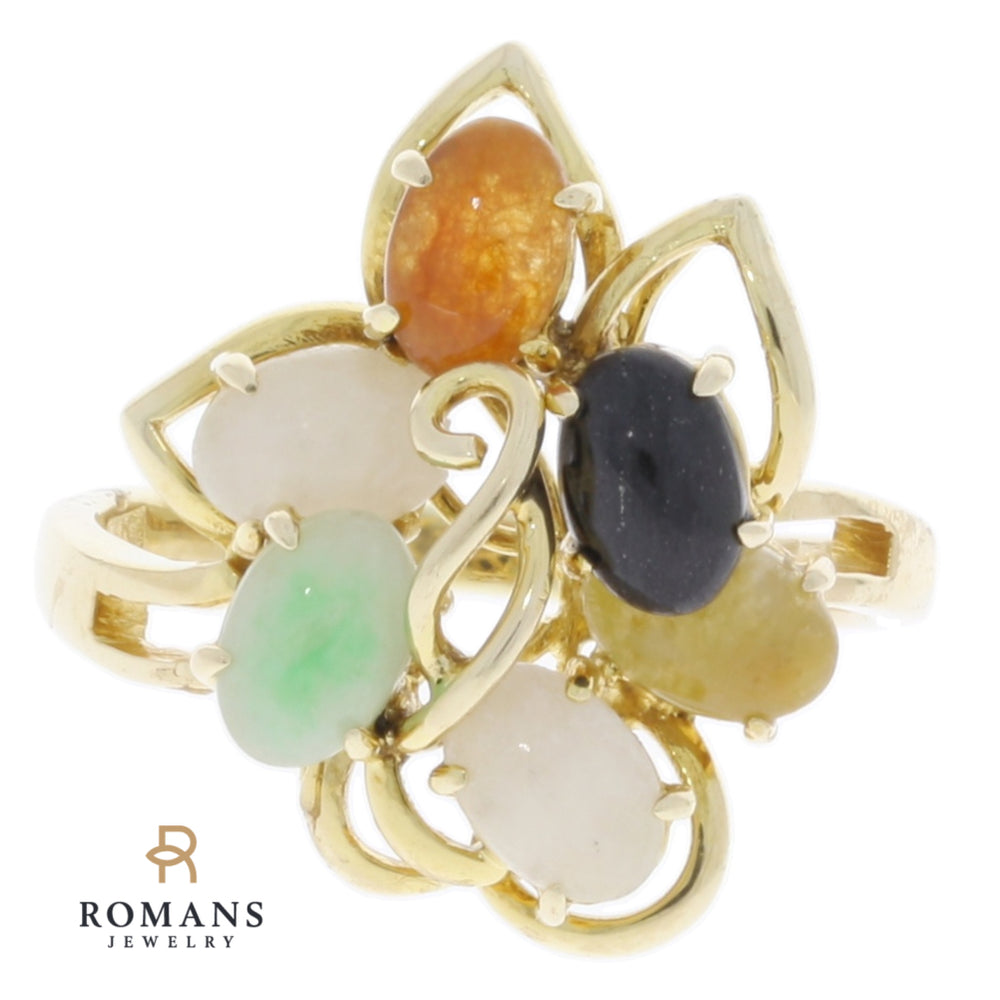 This Modern estate ring is truly show-stopping. Gorgeous multi-colored oval jade in appealing hues surrounded by ribbons of yellow gold, all perfectly complemented by a delicate band of warm yellow gold.