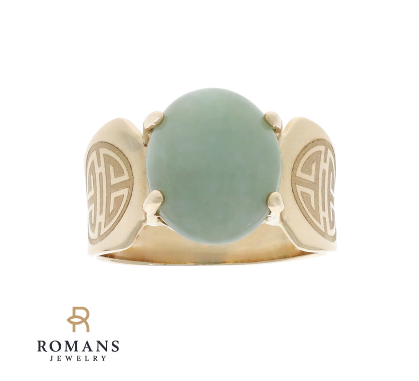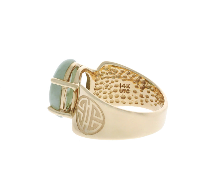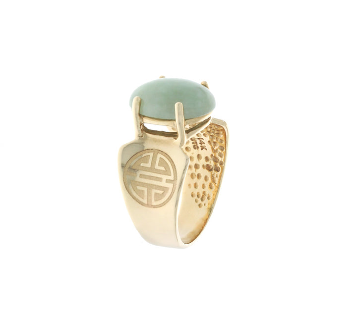 Beautiful oval cut natural jade solitaire on 14K yellow gold ring inspired by the joy of summer sunsets. This piece is inspired by its elements. The green has strong emotional correspondence with safety and symbolizes growth, harmony, freshness, and fertility.