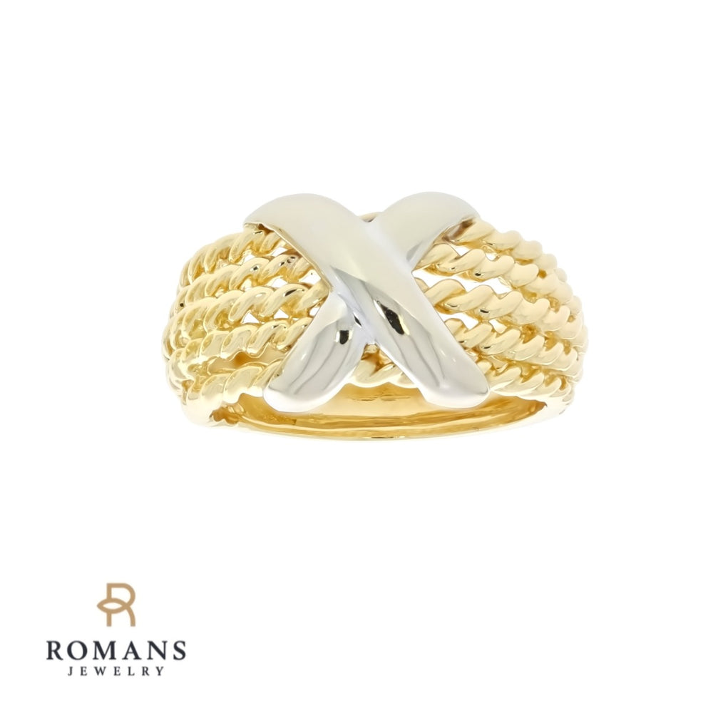 Elaborately crafted in 14k gold this two tone ring will leave you mesmerized. A white gold letter "x" set atop a five row rope style texture in yellow gold. The ring adds striking shine and a contemporary edge to any style.