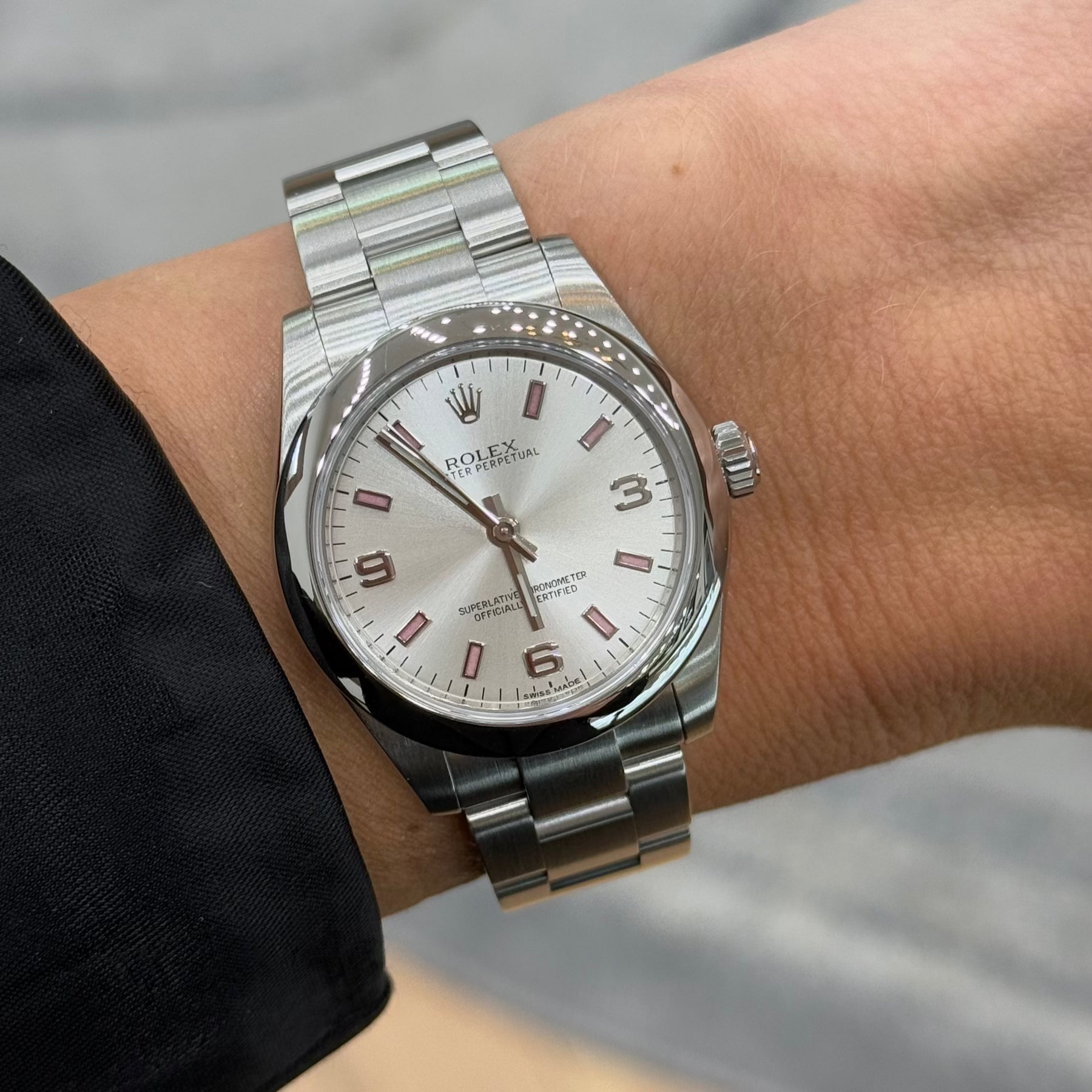 Luxurious and elegant, this ladies' Rolex Oyster midsize wristwatch is in mint condition, featuring a striking stainless steel case and band. The eye-catching silver dial is adorned with pink bar hour markers, silver Arabic numerals at 3, 6, and 9, and silver-tone hands, all protected by a scratch-resistant sapphire crystal. The polished bezel adds an extra touch of sophistication. The dial showcases "Rolex Oyster Perpetual" beneath the 12 o'clock position, "Superlative Chronometer Officially Certified" above the 6 o'clock mark, and "Swiss Made" below the 6 o'clock position. It features the original Rolex waterproof screw-down crown and an automatic 31-jewel movement. The reference number for this model is 177200, and the case measures 31mm in diameter. The Rolex Oyster link bracelet complements the watch and fits wrist sizes up to 7 inches. This timepiece has been authenticated by a master watchmaker, professionally serviced, and timed, and it comes with a two-year warranty. It also includes the original box, booklets, and tags, though it does not come with a card.