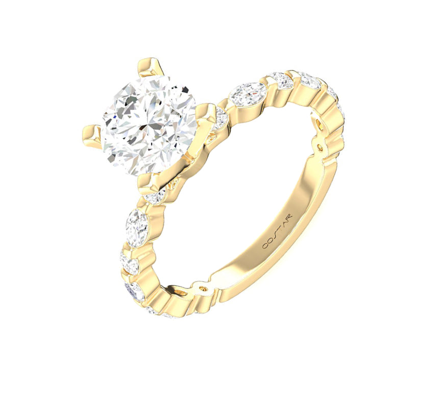 Express everlasting romance with this simply sophisticated engagement ring featuring 15 floating diamonds alternating between marquise and round shapes on either side of the center gem glittering brilliantly in this elegant 14k yellow gold mounting.
