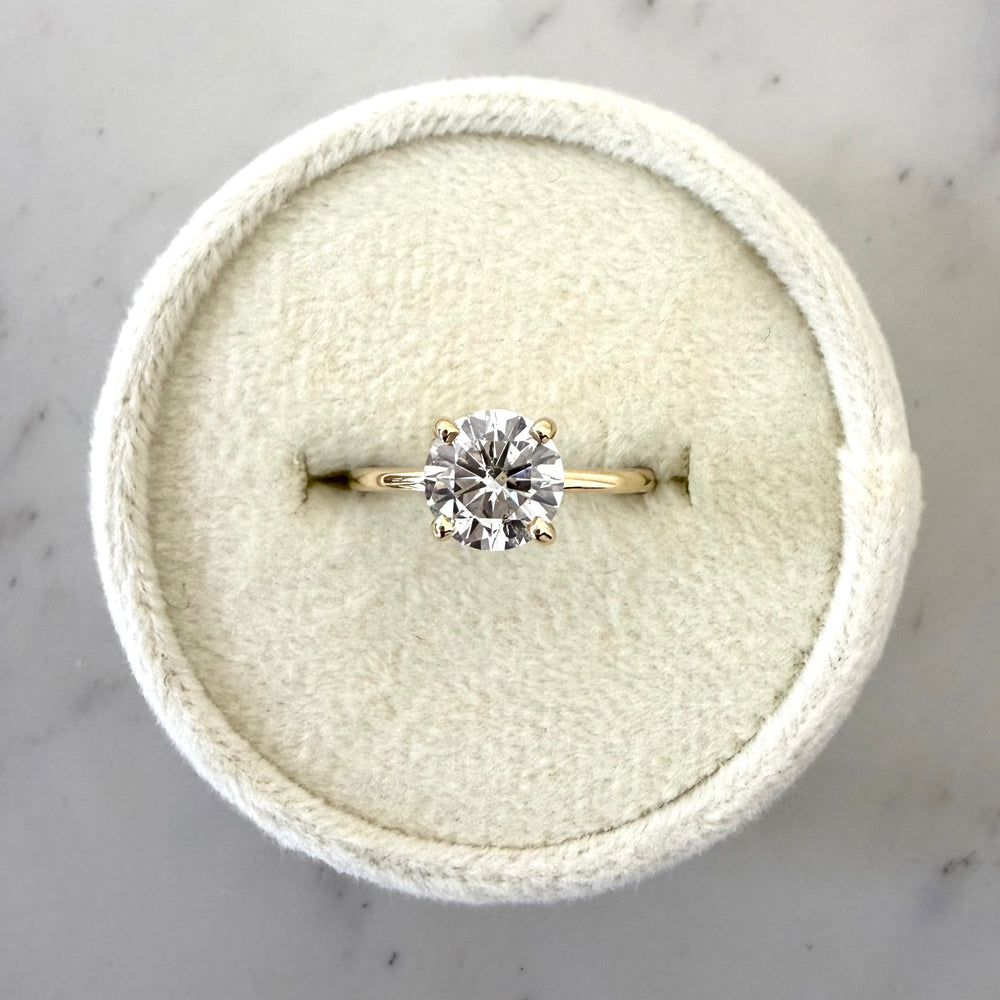 This elegant solitaire features a 1.59 carat weight round natural diamond set in a 4-prong yellow gold setting with a petite 14k yellow gold band that adds to the sleek, classic look of this engagement ring. Center round natural diamond has the clarity of I1 and the H color. GIA certificate 2235464635. Ring size 6.25.