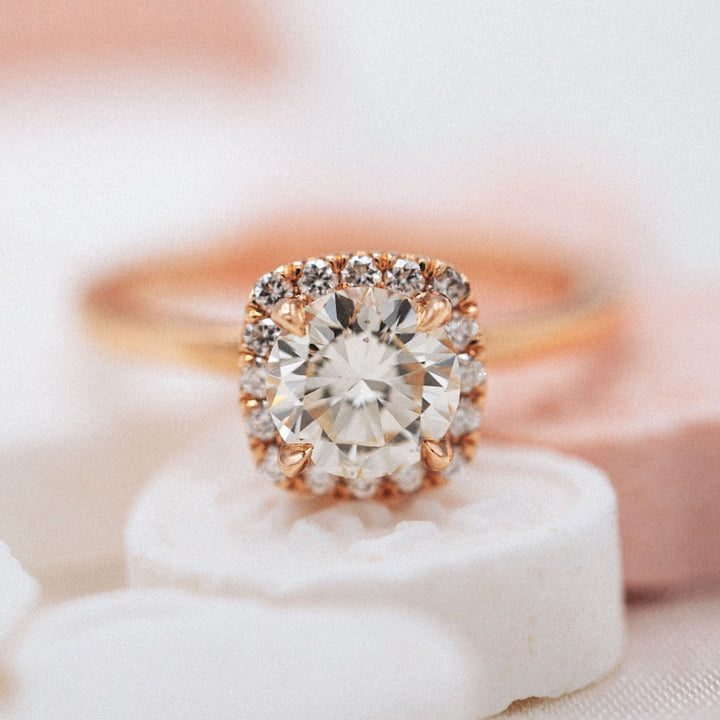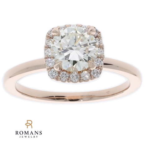 This sophisticated rose gold ring features an elegant halo of diamonds that wraps the center diamond in an aura of light. While the center diamond is secured by four prongs, adds a sleek element to this subtly perfect design.