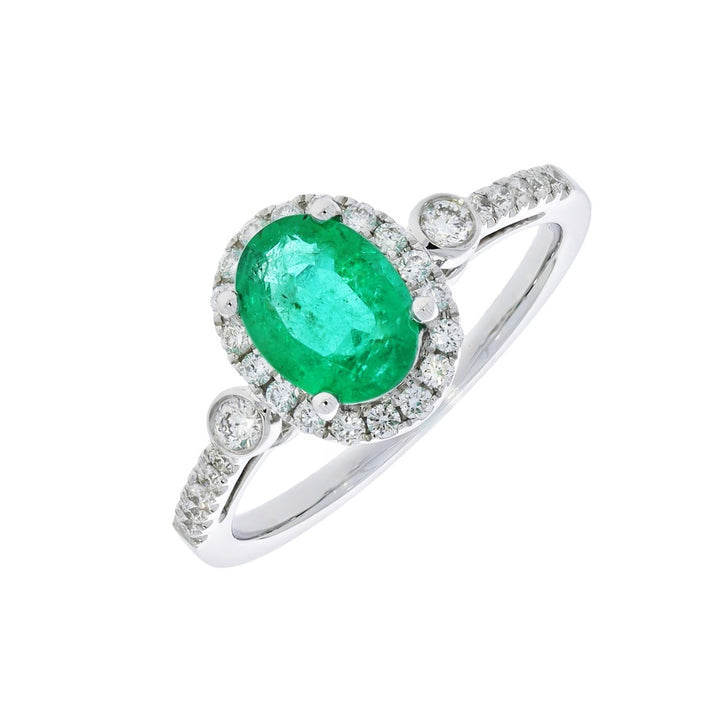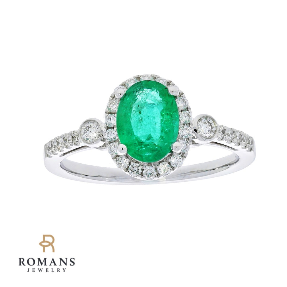 This alluring oval emerald and diamond halo ring is an excellent choice. Crafted in bright 14k white gold, this ring features oval emerald surrounded by sparkling halos of micropavé diamonds. It's an alluring piece perfect for beautiful woman.