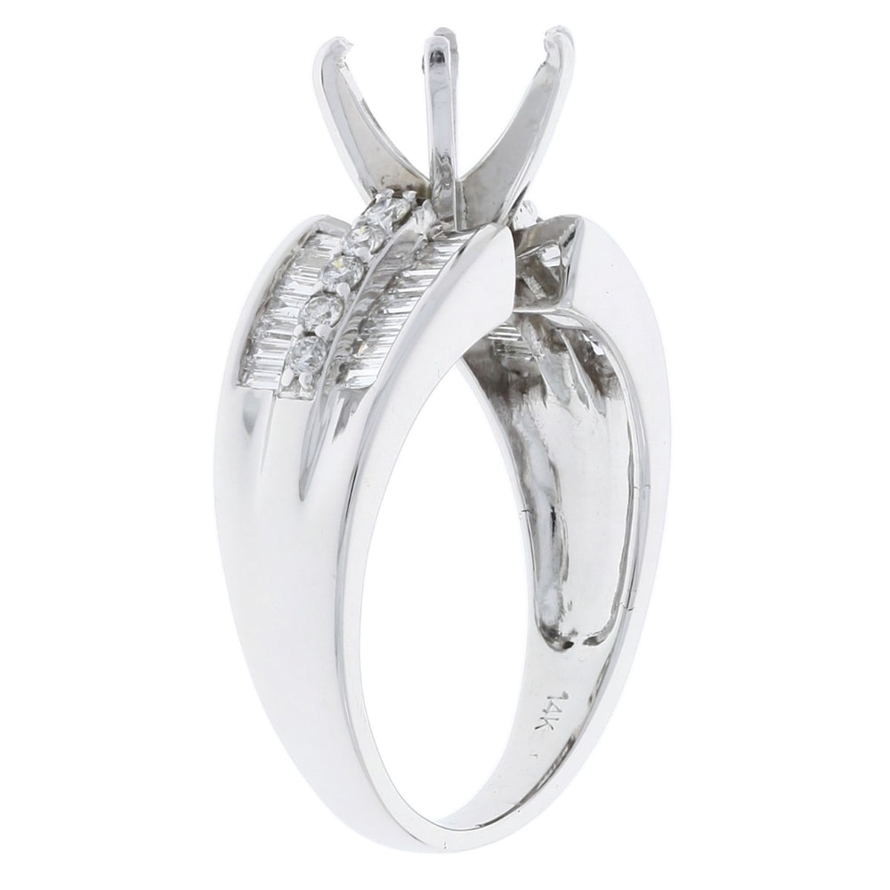 Captivating baguette and round diamonds adorn the shoulders of this stunning ring, brilliantly framing the center gem and exuding a look of chic sophistication.