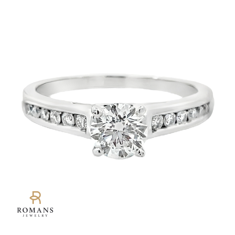 This stunning engagement ring features a round diamond at its center, beautifully set in 14K white gold. The band is accented with additional diamonds channel set, enhancing the center stone’s brilliance and adding extra sparkle. With its timeless design and elegant details, this ring is the perfect symbol of love and commitment.