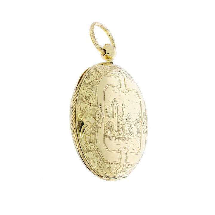 Beautiful and elegant 1880's F.H. Cooper London pocket watch. Features a striking solid 18k yellow gold case with an extraordinary design. Looking at the front of the pocket watch case there is a portrait of a house by a body of water with ribbons around and going onto the other side. Beautiful porcelain dial with black roman numerals accompanied by intricately detailed black hour and minute hands. Inner case cover signed B & S 18 9764. Inner back case cover signed B & S 18 9764. This pocket watch is key wind and key set, 13 jewels. It's in great condition. Its case measures 53mm diameter, and 15mm thick. Serviced and timed, comes with a one year warranty.