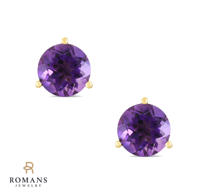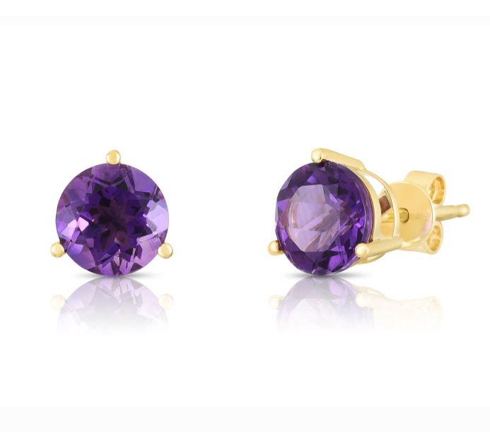 Classic and beautifully matched, these vibrant amethyst stud earrings feature round amethyst gemstones set in 14K yellow gold four-prong settings with comfortable push-back posts. Their petite size makes them a great everyday jewelry option.