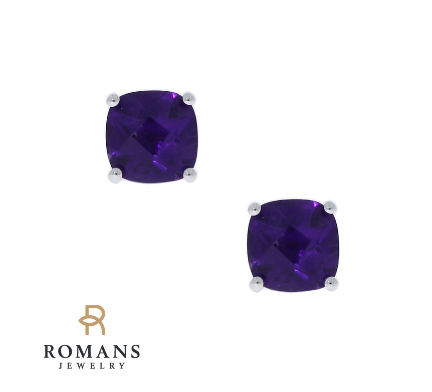 These earrings feature a beautifully matched pair of cushion amethyst secured in classic 14k white gold basket settings with push back posts.