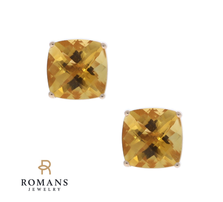 Classic and beautifully matched, these vibrant citrine stud earrings, feature cushion cut citrine gemstones set in 14k rose gold four-prong settings with comfortable push-back posts. Their size makes them a great everyday jewelry option.
