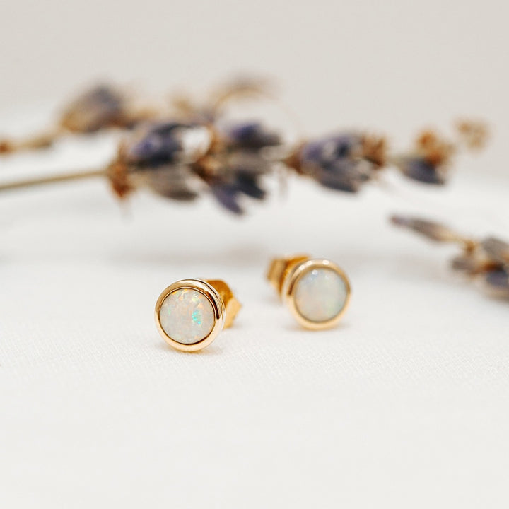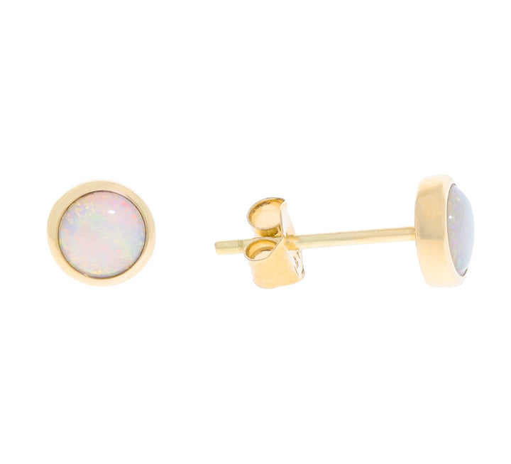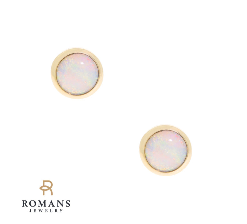 Color outside the lines with these opal stud earrings. A pair of perfectly matched round opals with a rainbow of sparkle are set in classic 14k yellow gold bezel settings perfect for adding personality to your everyday attire.