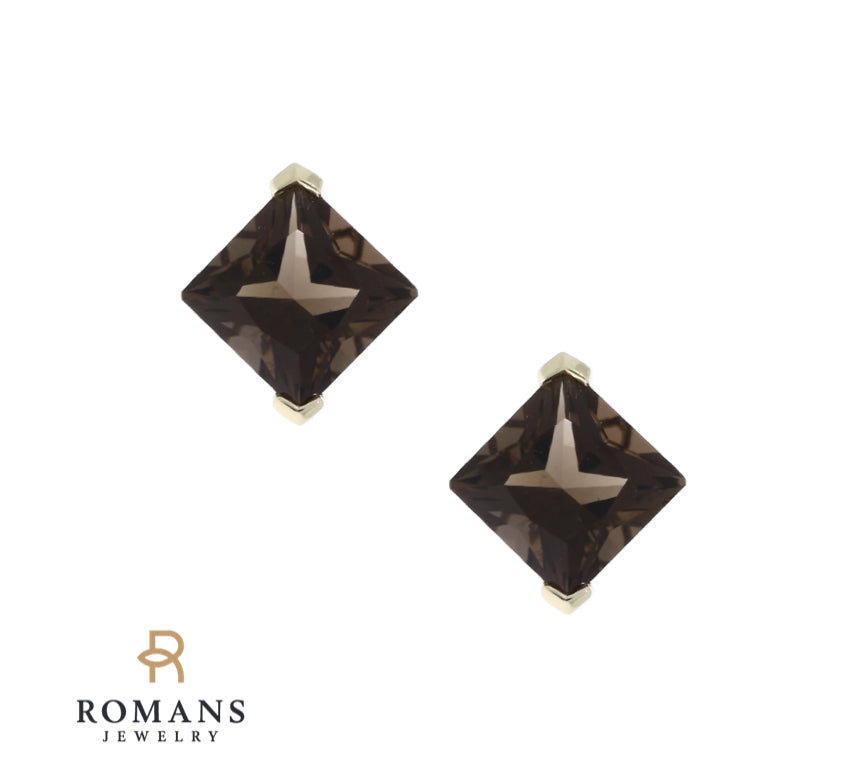 Classic and beautifully matched these smoky quartz stud earrings feature triangular smoky quartz set in 10K yellow gold two-prong settings with comfortable push back posts.