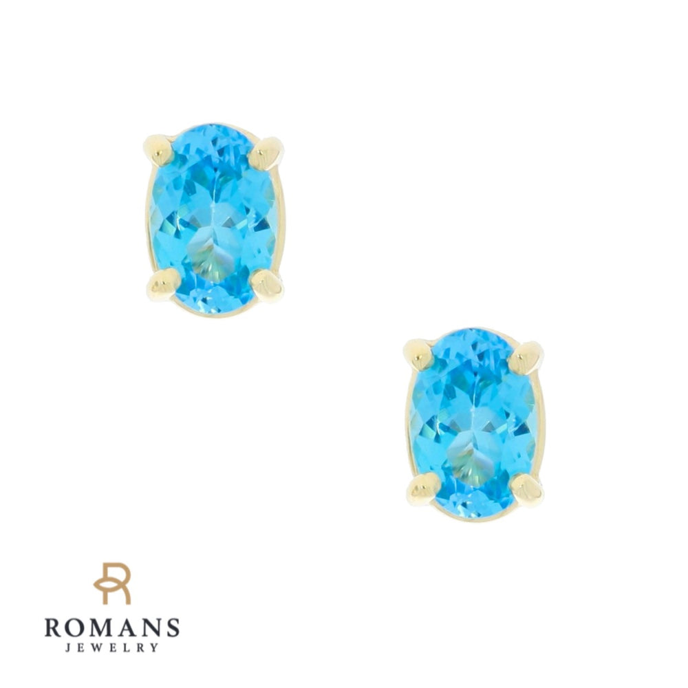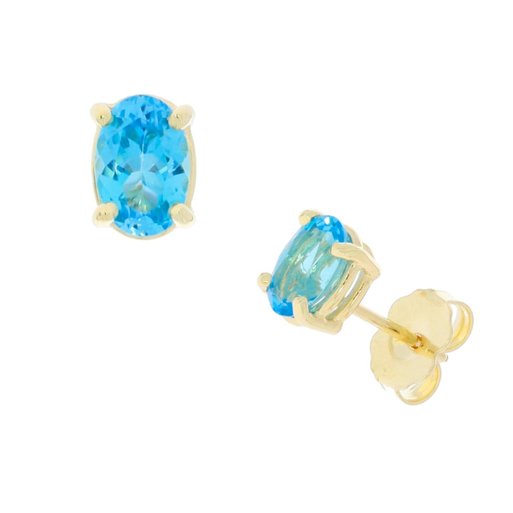 Classic and beautifully matched, these vibrant blue topaz stud earrings feature oval topaz gemstones set in 14K yellow gold four-prong settings with comfortable push-back posts. Their petite size makes them a great everyday jewelry option.