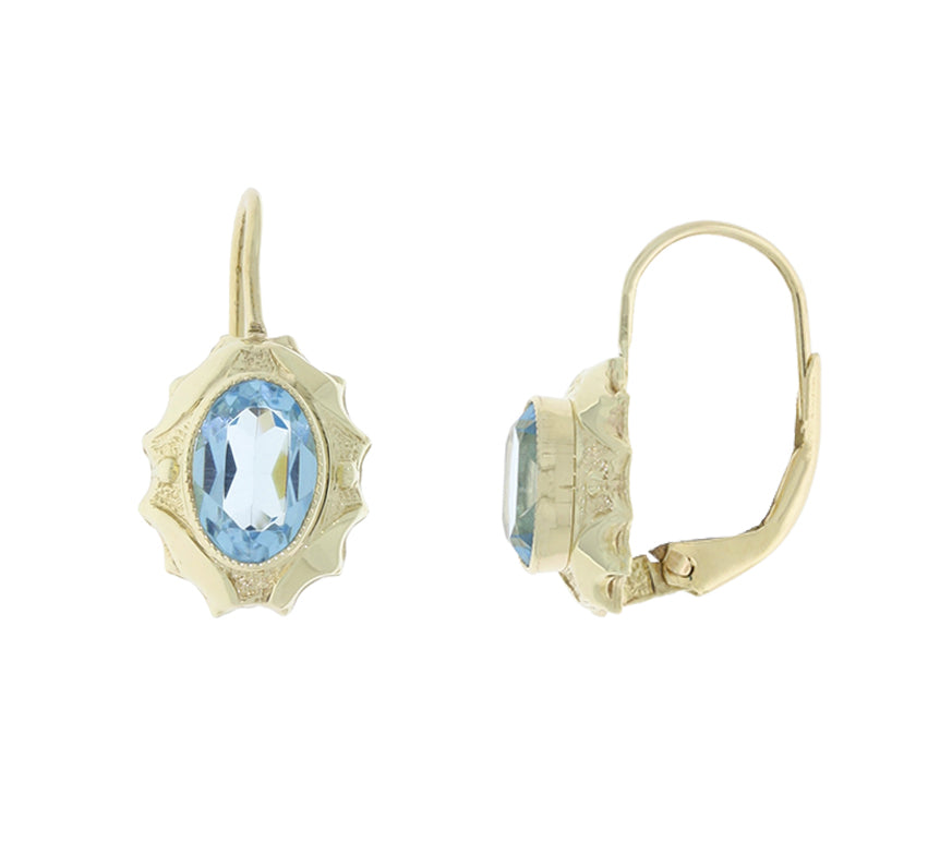 These luxurious vintage drop earrings feature exquisite center oval blue topaz embraced by gold texture. These earrings feature secure lever backs that keep the earrings in place.