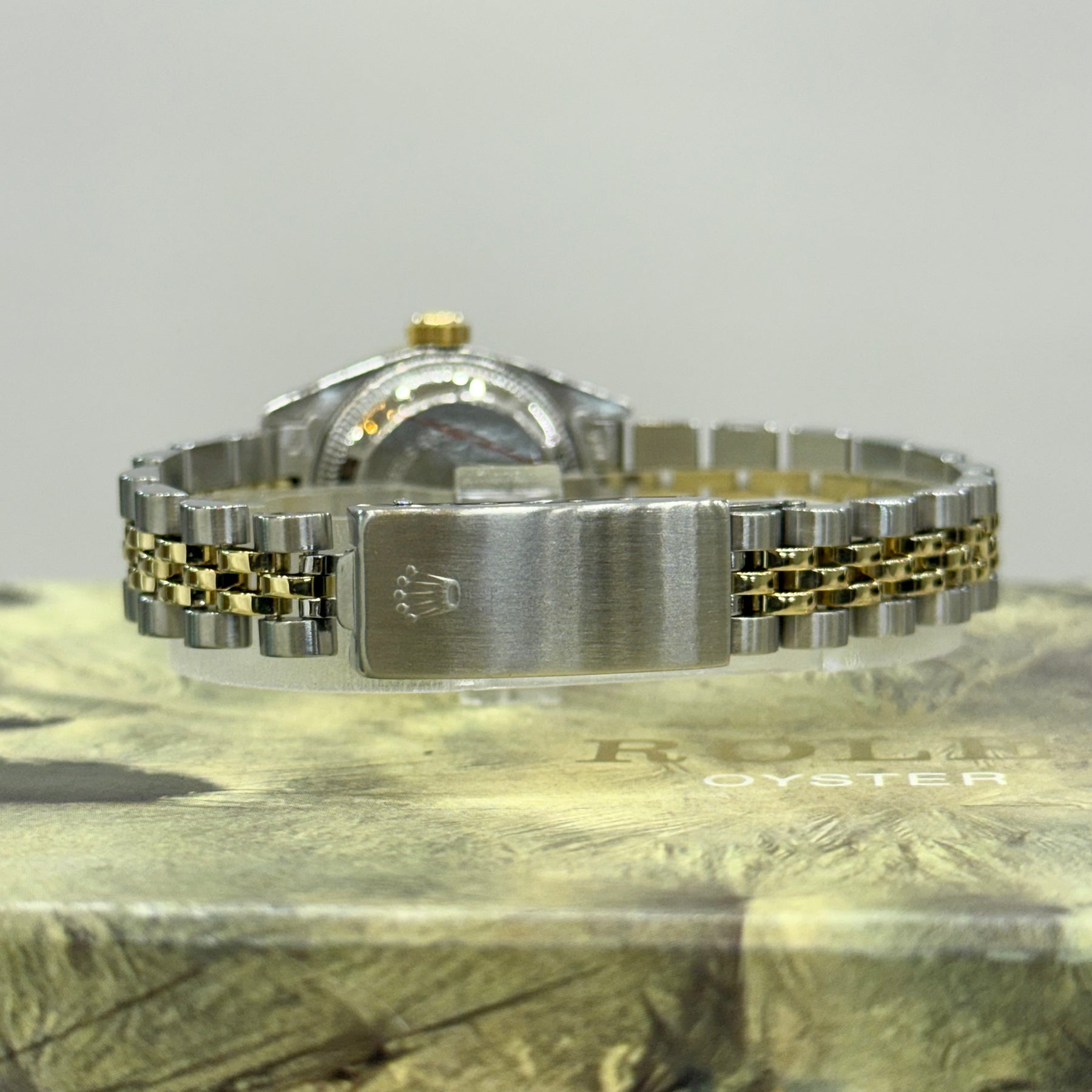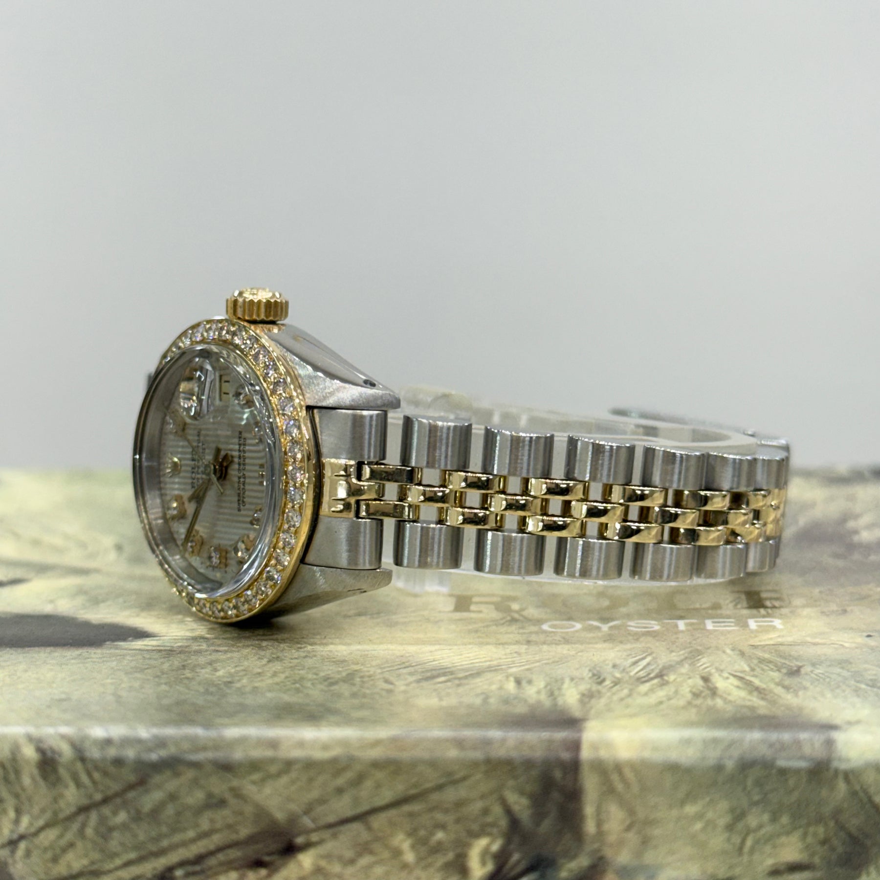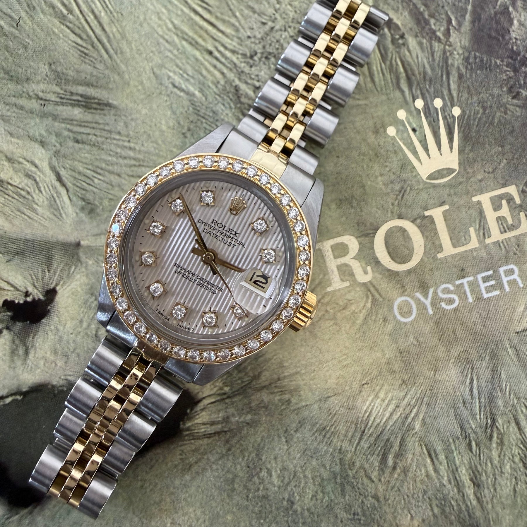 Luxurious and beautiful ladies Rolex Oyster Perpetual Datejust wristwatch made in 1982. Its gorgeous style features a striking blend of stainless steel and 18K yellow gold. An original tapestry diamond dial accompanies the two-tone case and is set with yellow gold sweeping hour, minute, seconds hands, and hour markers. Acrylic crystal with date window @ 3, and original screw down crown. A beautiful aftermarket diamond gold bezel. The dial is signed Rolex Oyster Perpetual underneath 12 o'clock, Superlative Chronometer Officially Certified above 6 o'clock, and T Swiss Made T underneath 6 o'clock. Automatic movement. Reference number 6917, case serial number 7131736. Its case measures 32mm lug to lug, 26mm diameter excluding the crown, and 11mm thick. Its jubilee two tone link bracelet compliments this watch. This watch has been serviced and comes with a two year warranty. Comes with original box.