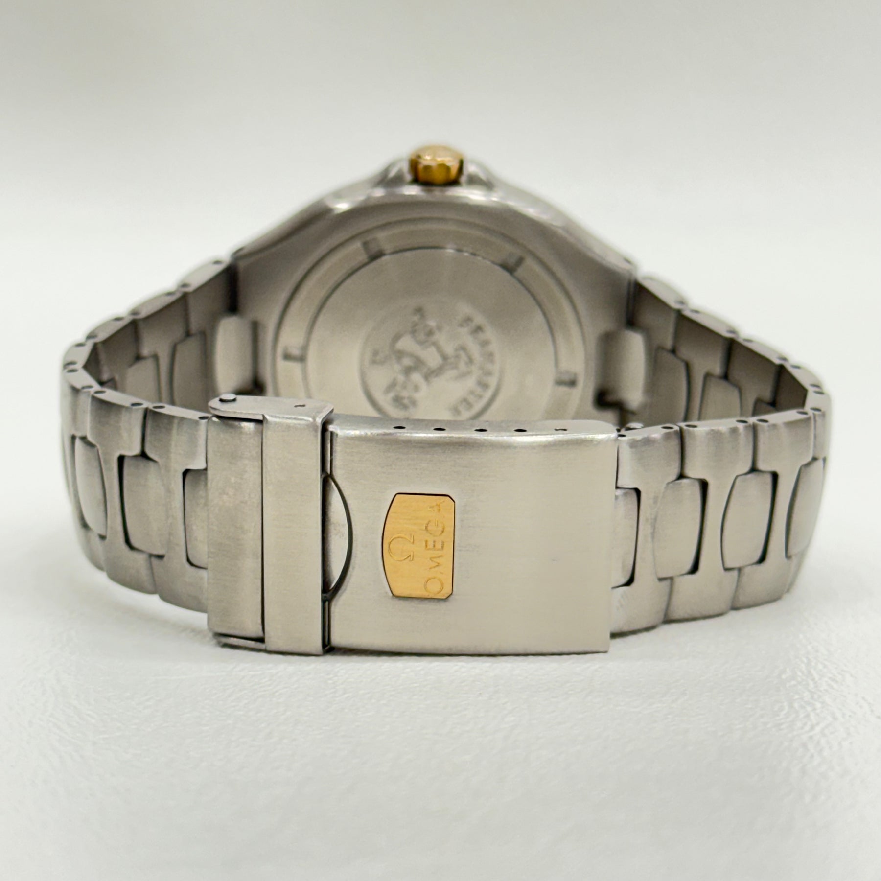Crafted in stainless steel with 18K yellow gold accents on the bezel and crown, this two-tone Seamaster blends sporty function with refined elegance. The black dial with luminous hour markers, gold-tone hands, and date at 3 o’clock offers excellent legibility. Featuring its original signed Omega crown, sapphire crystal, and professional diver functionality, this watch is both a collectible and a wearable classic.