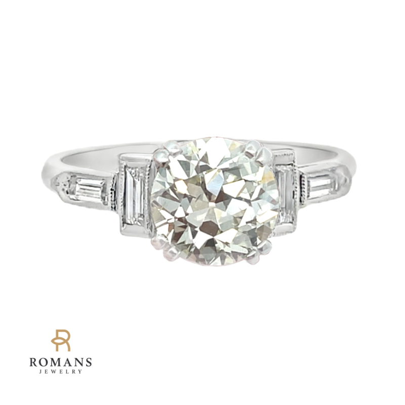 Delicate and beautiful, this vintage-inspired Art Deco engagement ring showcases a stunning 1.52 carat Old European cut diamond at its center. The sparkling center diamond is complemented by petite baguette-cut diamonds on each side, adding an extra touch of elegance.