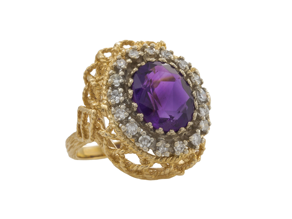 A glistening  oval amethyst is surrounded by a halo of 18 round single cut diamonds set in this 1970s 14K yellow gold ring.  Woven elements and intricate openwork come alive in this wonderful ring.