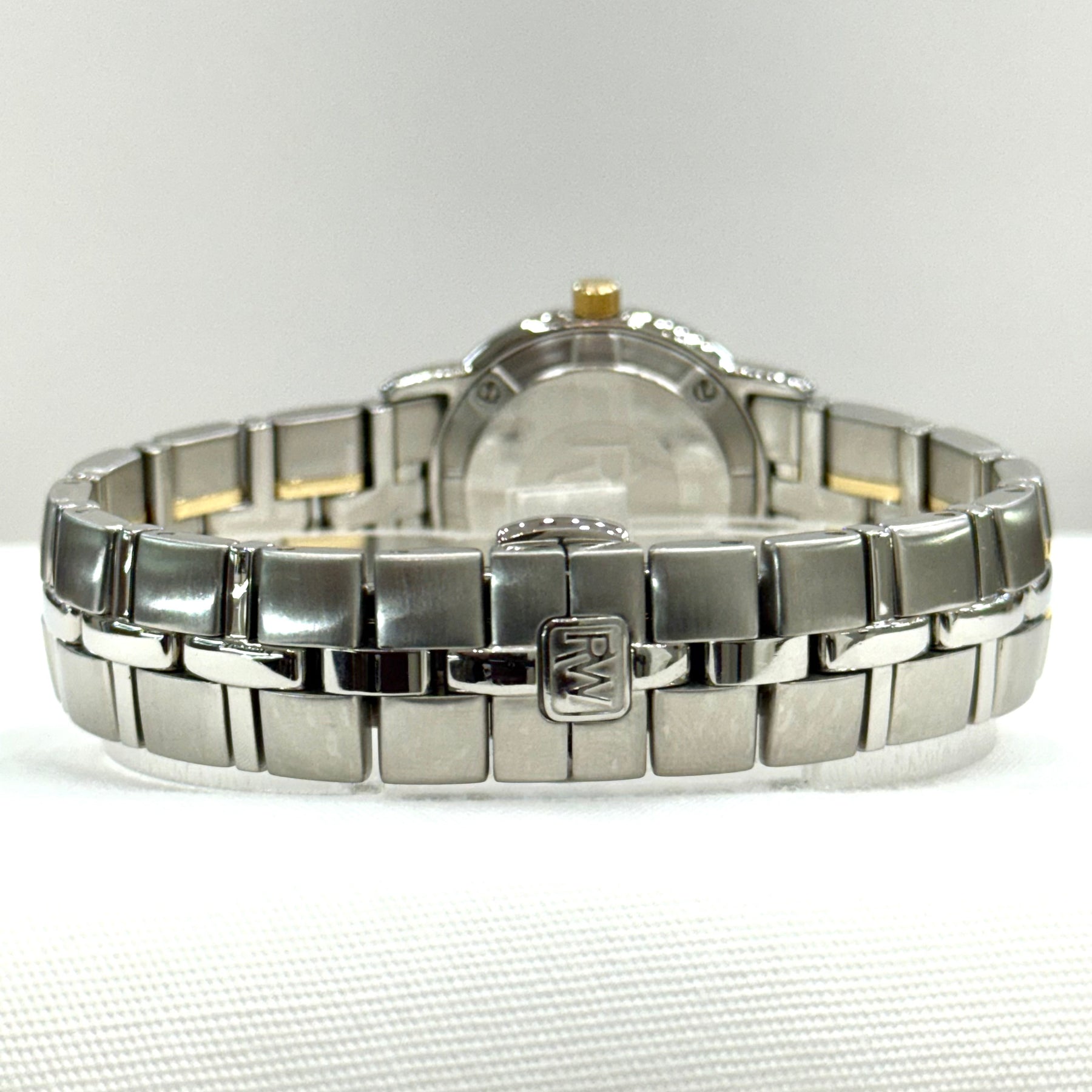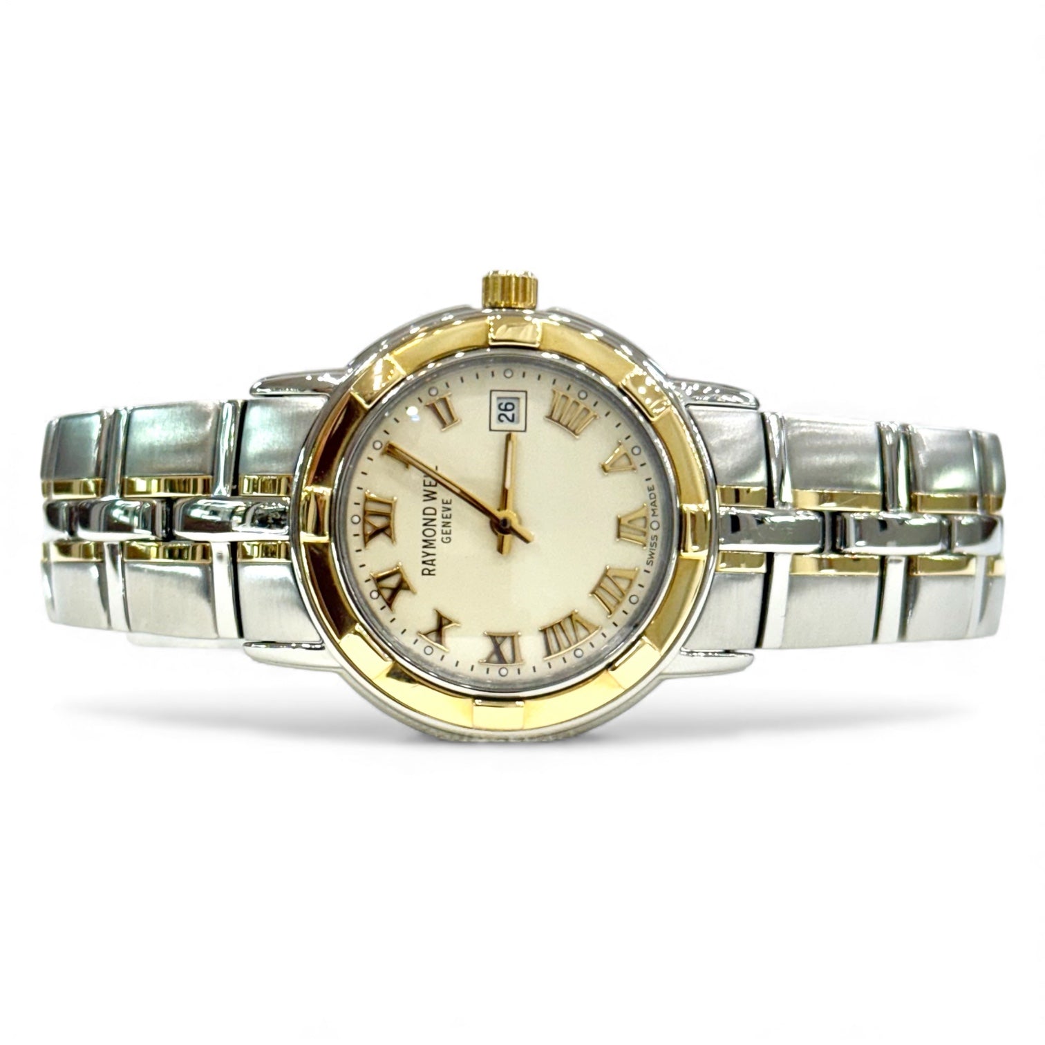This elegant Raymond Weil ladies wristwatch, reference 9440, features a refined two-tone stainless steel and gold-tone design paired with a classic light dial accented by gold tone Roman numeral hour markers and gold tone hands. A discreet date window at 3 o’clock adds everyday functionality, while the sapphire crystal provides excellent scratch resistance and long-lasting clarity. Designed with timeless Swiss elegance, this watch is both versatile and sophisticated, perfect for daily wear or dress occasions. The polished bracelet and balanced case proportions make it a graceful addition to any luxury watch collection. Case back is engraved STAINLESS STEEL, WATER RESISTANCE, 10 ATM, SAPPHIRE CRYSTAL, SWISS MADE, 9440, V091160, RW. Current wrist size 6.75". Its case measures 31mm lug to lug, 27mm diameter excluding the crown, and 7mm thick. This watch has been serviced and comes with a one-year warranty.
