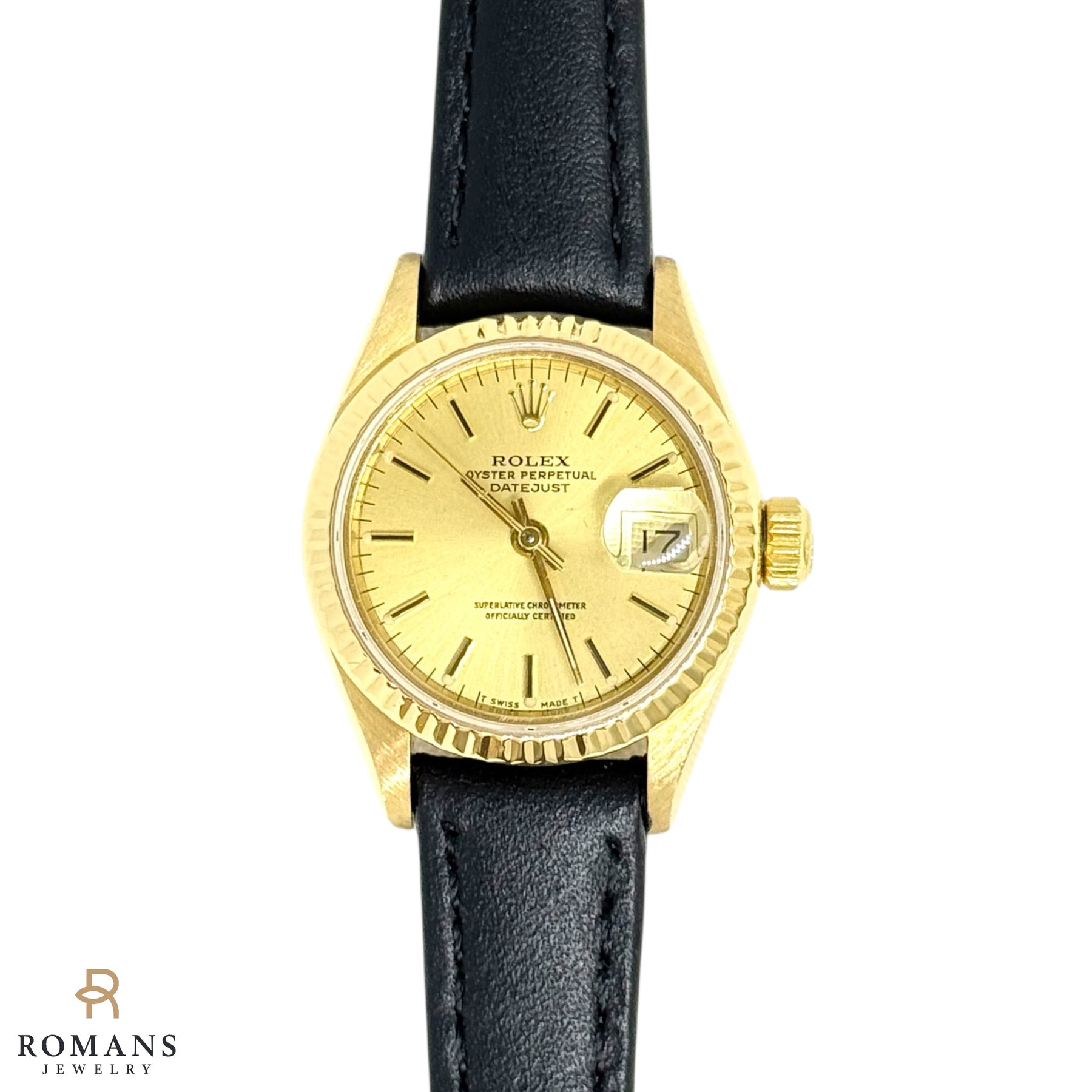 Luxurious and beautiful ladies 1988 Rolex President oyster perpetual date-just wristwatch. Its gorgeous style features a striking 18K yellow gold case An alluring gold dial accompanies the gold case and is set with yellow gold hour, minute, seconds hands, and hour markers. Scratch resistant sapphire crystal with a magnifier window for the date. This timepiece also features a beautiful fluted gold bezel. The dial is signed Rolex Oyster Perpetual Datejust underneath 12 o'clock, Superlative Chronometer Officially Certified above 6 o'clock, and T Swiss Made T underneath 6 o'clock. Original Rolex waterproof screw down crown. Automatic Β jewel movement, caliber 2135. Reference number 69178, Serial number R569913. Its case measures 32.5mm lug to lug, 26mm diameter excluding the crown, and 10.5mm thick. It comes with original box, papers and an extra red strap. This watch has been serviced and comes with a two year warranty.Β