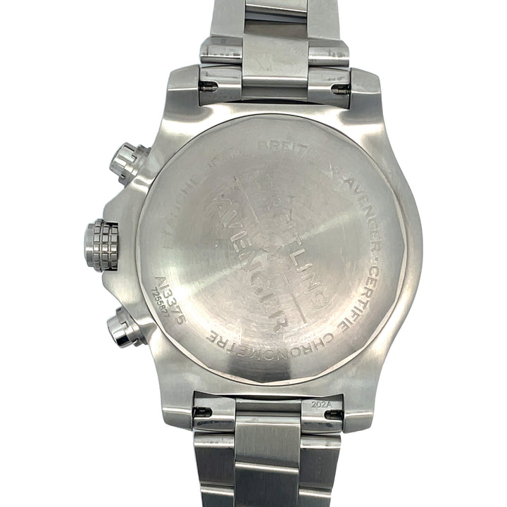 Sporty and durable gentlemen's  Avenger Chronograph Breitling wristwatch, a superb addition to any collection. This wristwatch features a striking blend of stainless steel case. A beautiful black dial set with silver & white tone hour and minute hands. Date window at three o'clock. This timepiece also features a tachymeter bezel and three sub-dials (60 seconds, 30 minutes, 12 hours). This dial is in great condition. Its dial is marked Breitling 1884 Chronometer Avender with a Breitling logo by the date window. Its scratch resistant sapphire crystal is in excellent condition. Reference number A13375, serial 7255827. Case back is marked ETANCHE 300M - BREITLING AVENGER - CERTIFIE CHRONOMETRE - A13375 - 7255827. Contains an automatic movement caliber # Breitling 13 Its case diameter measures 48mm excluding the crown, 58.5mm lug to lug, and 18mm thick. Fits wrist size up to 8.50-inch. An original stainless steel band with original buckle compliments this watch. Verified authentic by a master watchmaker, serviced and comes with original box and papers and two year warranty.
