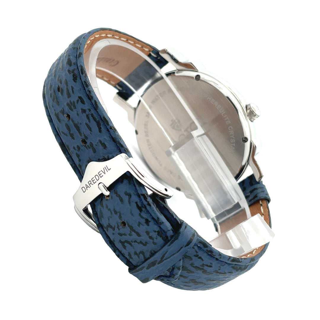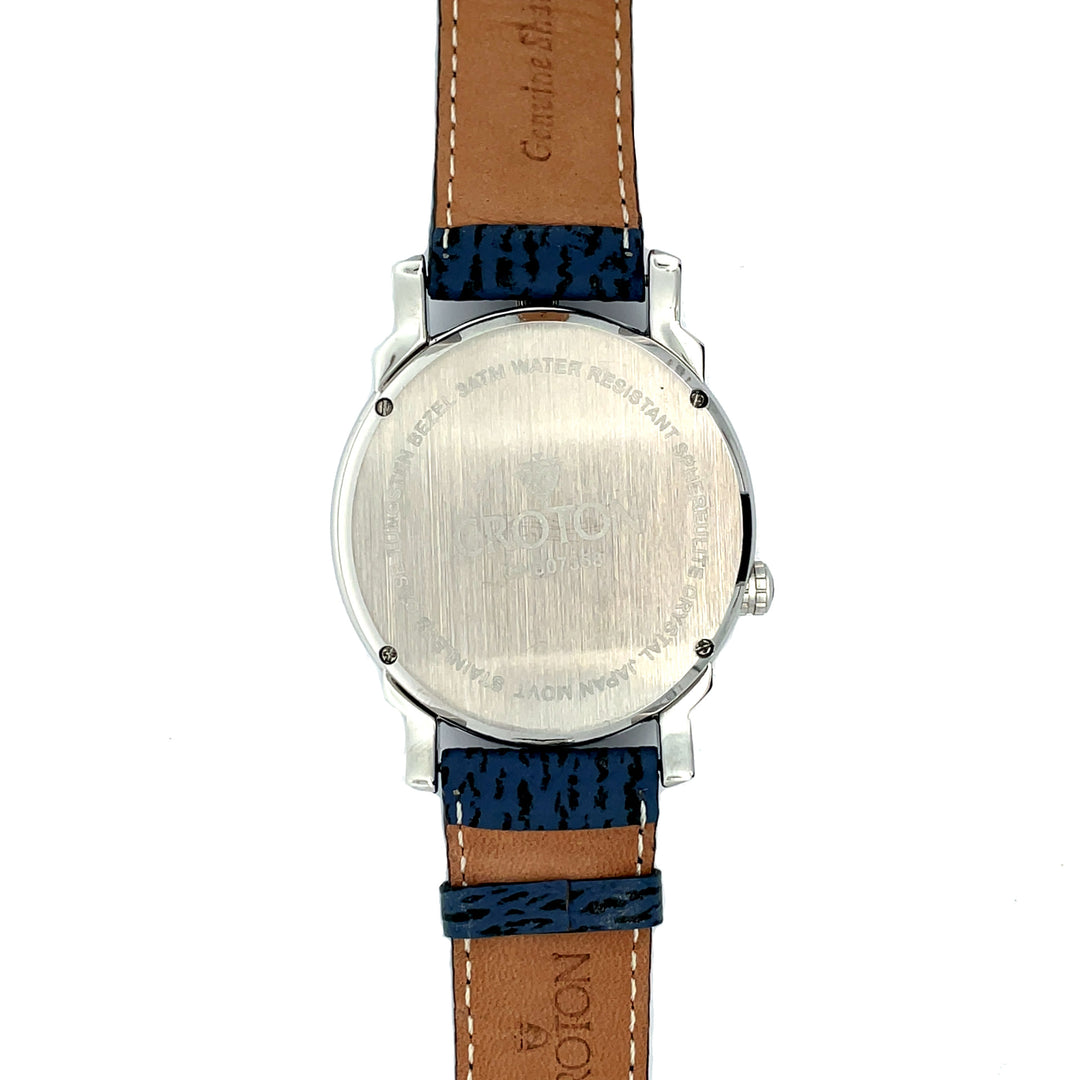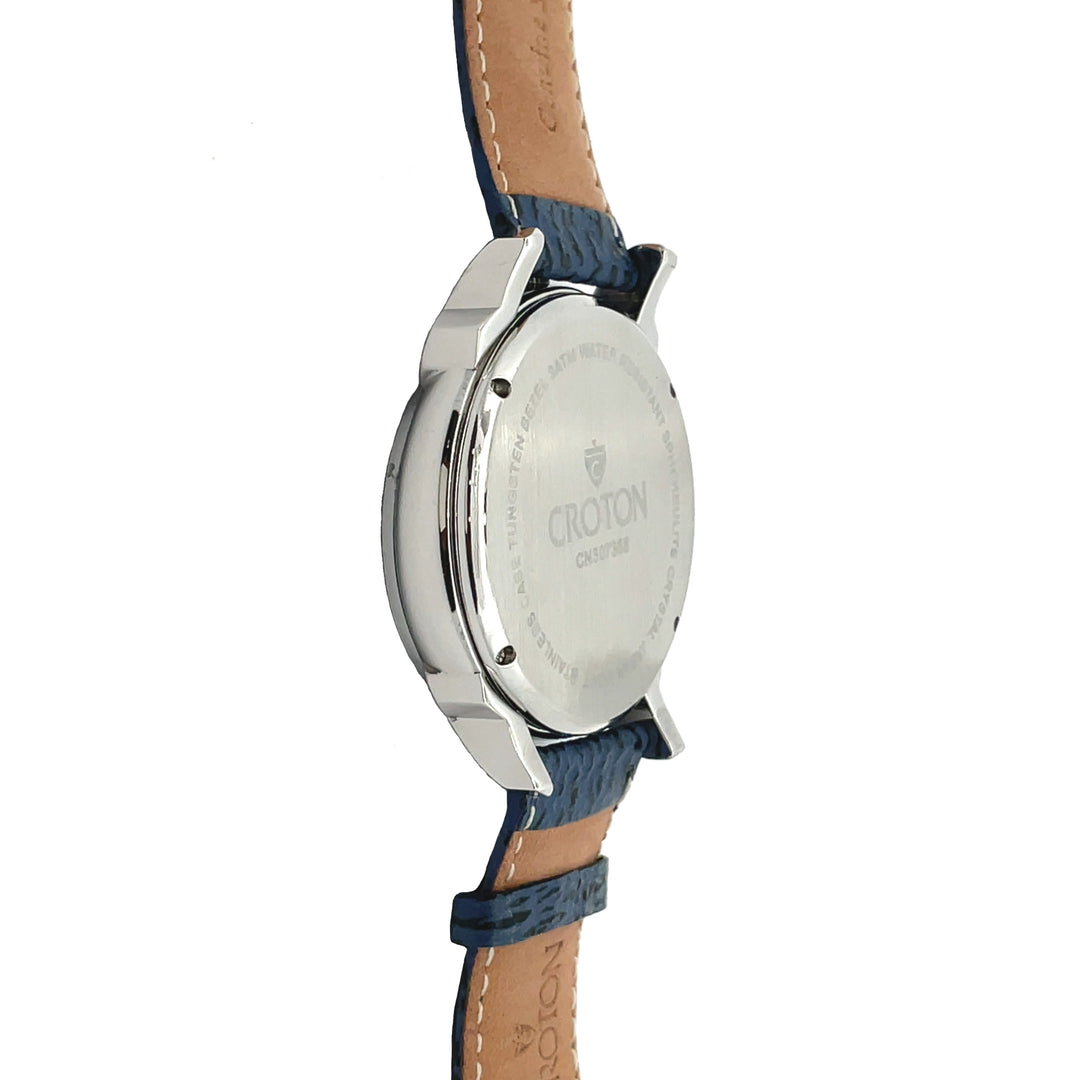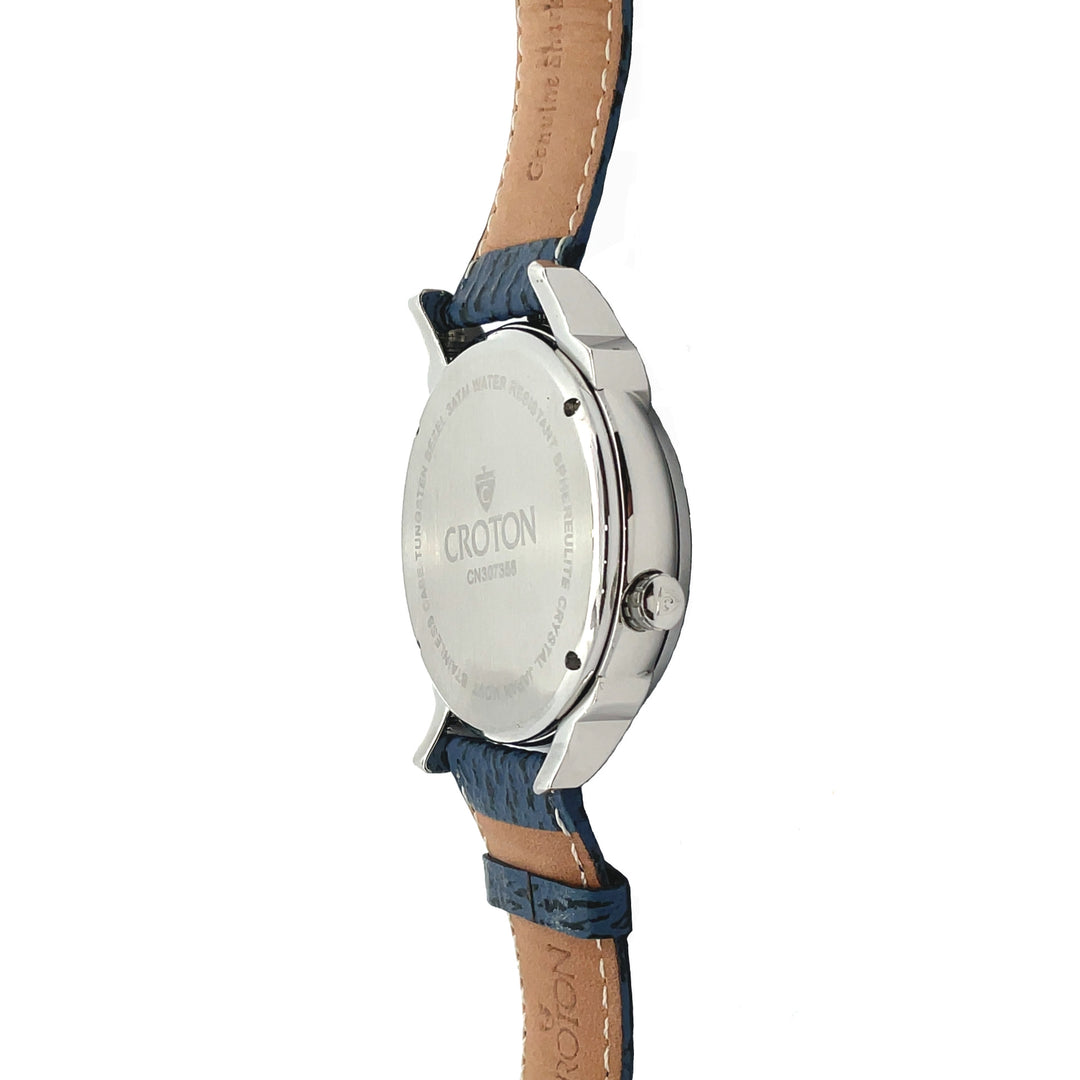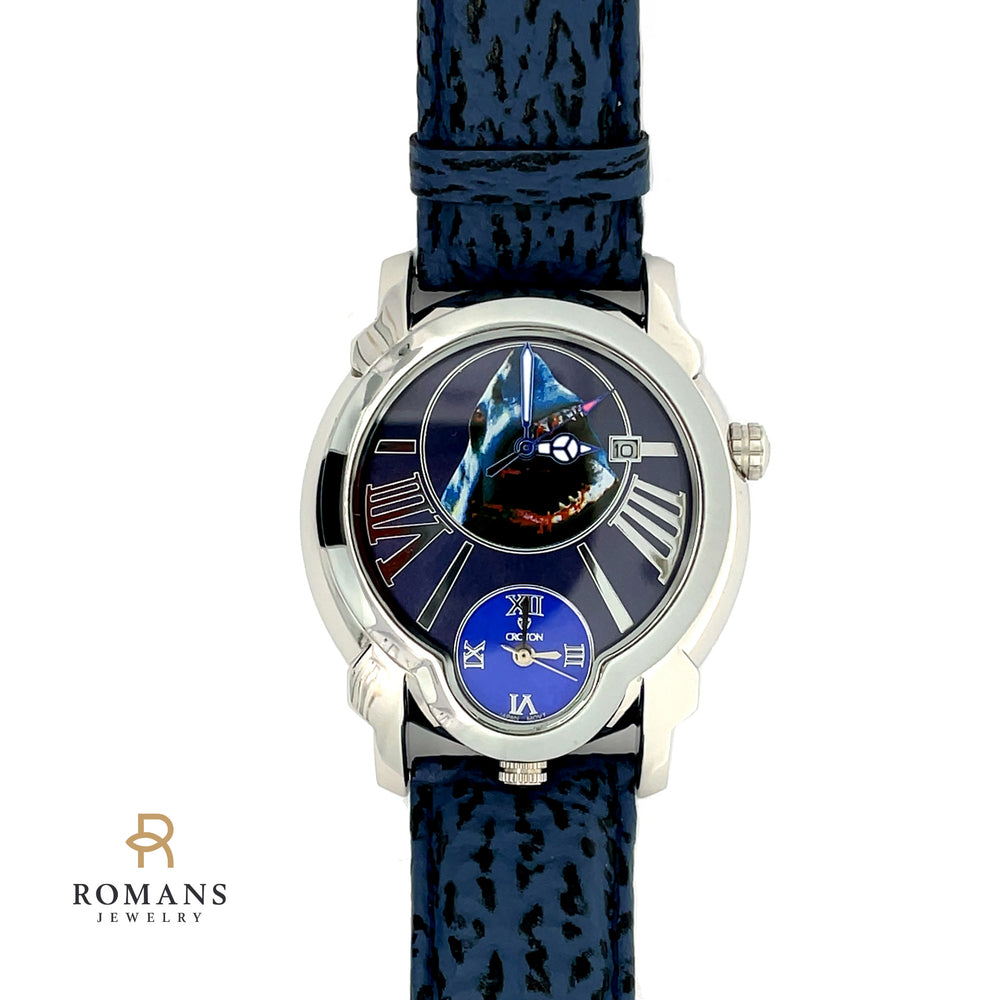 Luxurious and durable gentlemen's Croton Great White Shark Dual Time Zone  wristwatch. Features a striking polished stainless steel case and band that accompanies the beautiful blue toned textured dial. Classic silver & blue toned hour markers and sweeping hour and minute hands. CROTON is signed underneath 12 o'clock & date window is at 3 o'clock. This watch has a quartz movement. Its sapphire crystal is in mint condition. The case back is signed , STAINLESS STEEL CASE, TUNGSTEN BEZEL, 3ATM WATER RESISTANT, CN307358. This watch measures 53mm lug to lug, 43mm diameter excluding the crown, and 13mm thick. This watch comes with its original shark leather band. Verified authentic by a master watchmaker, serviced and comes with a one year warranty.