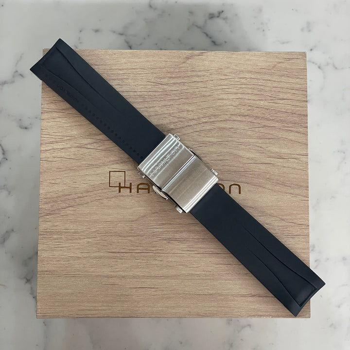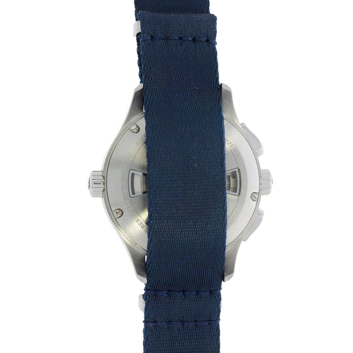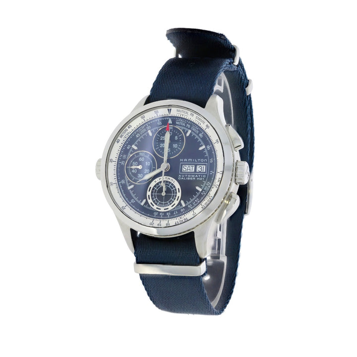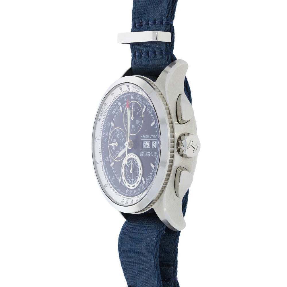 Luxurious and classic Hamilton Khaki X-Patrol Automatic wristwatch. Features a striking stainless steel case and a navy blue nylon strap. A classic black and silver dial accompanied by lume filled silver toned hands and hour markers. This timepiece also features a day and date window at three o'clock, Chronograph - three sub-dials displaying: 60 second, 30 minute and 12 hour, and fixed stainless steel bezel with tachymeter. This watch has a scratch resistant sapphire crystal. Its dial is signed Hamilton Automatic Caliber H21 at the 3 o'clock position. Hamilton patented screw down crown. This watch has an automatic 25 jewel movement. Reference # H765560. A skeleton case back reveals the watch movement. Its case measures 52mm lug to lug, 42mm diameter excluding the crown, and 15.5mm thick. This watch has been serviced, timed, and comes with a two-year warranty. This watch also comes with its original box, papers, and a black rubber strap replacement with a stainless steel buckle.