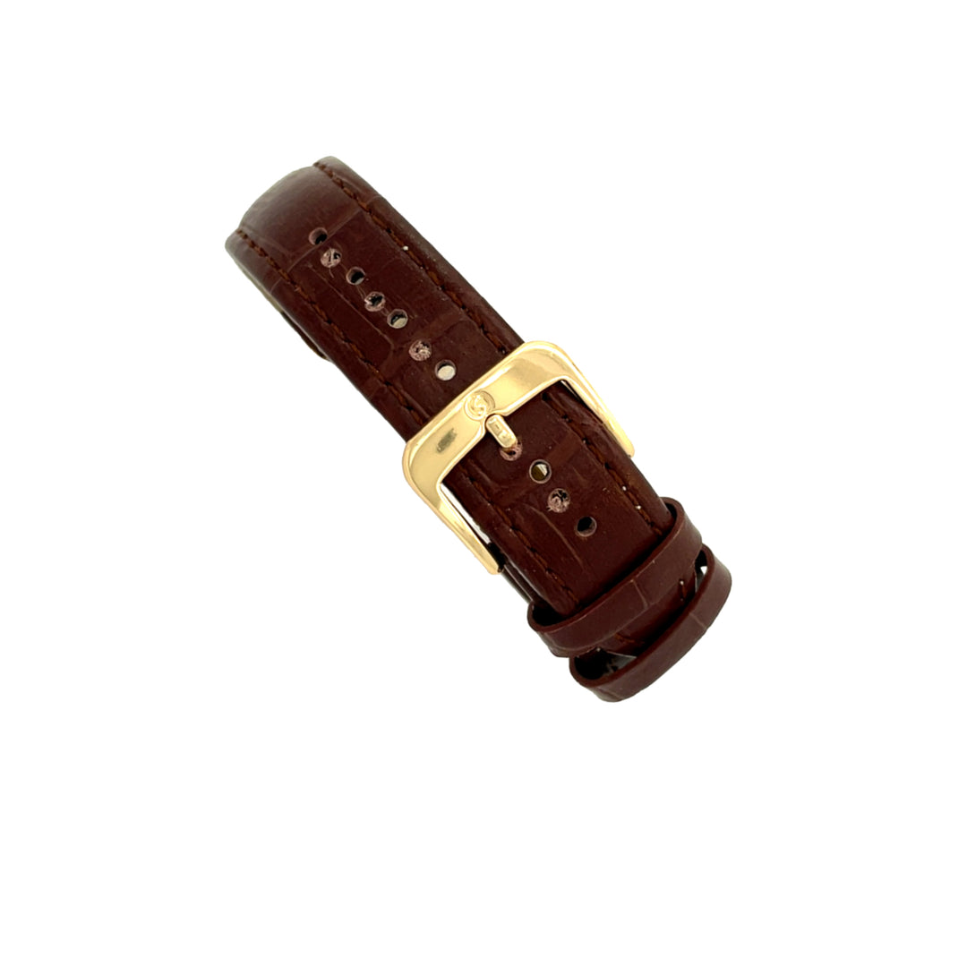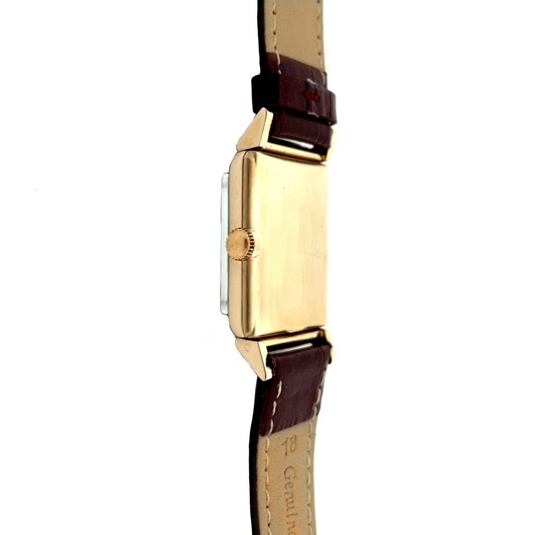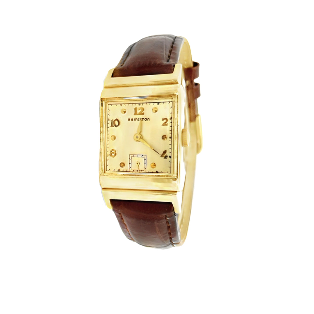 Dressy classic Hamilton Wesley tank style wristwatch. This beautiful vintage timepiece is crafted in 14k yellow gold and dates from around the 1940s. This classic gold case pairs perfect with its cream dial. The striking dial is set with gold tones hands, gold tone arabic numbers and square markers. Its dial is signed Hamilton underneath 12 o'clock, Its crystal is in excellent condition with no visible scratches. Yellow gold tone manual wind and set crown. Mechanical hand wind 19 jewel caliber 982, M70922 movement. Inside case back is stamped 14K Gold  Hamilton W. CO Lancaster PA. S403566. Its case measures 41mm from lug to lug, 23mm diameter excluding the crown, and 8mm thick. A beautiful genuine dark brown leather band and a yellow tone buckle compliments this watch. A fantastic vintage dress watch. This watch has been verified authentic by a master watchmaker, serviced, timed, and comes with a one year warranty.