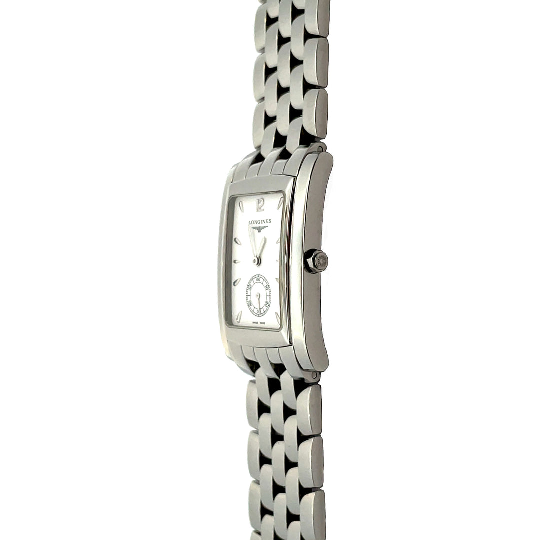 Luxurious and classic ladies Longines DolceVite wristwatch. Features a striking stainless steel case and band with an alluring matte white dial accompanied by the silver toned hands. The case and band does show slight wear. This timepiece also features a sub dial at six o'clock. This watch has a scratch resistant sapphire crystal. Its beautiful dial is signed Longines underneath 12 o'clock, and Swiss Made underneath the 6 hour marker. The name Longines is visible on the crown. This watch has a quartz movement, serial #29950987 ,& ref# L5.655.4.16.6. The case back is signed STAINLESS STEEL, SWISS MADE. Original Longines stainless steel link band compliments this watch. Its case measures 39.5mm lug to lug, 26.5mm diameter excluding the crown, and 6.5mm thick. Fits wrist size up to 7.25-inches. This watch has a fresh new battery and comes with a one-year warranty.
