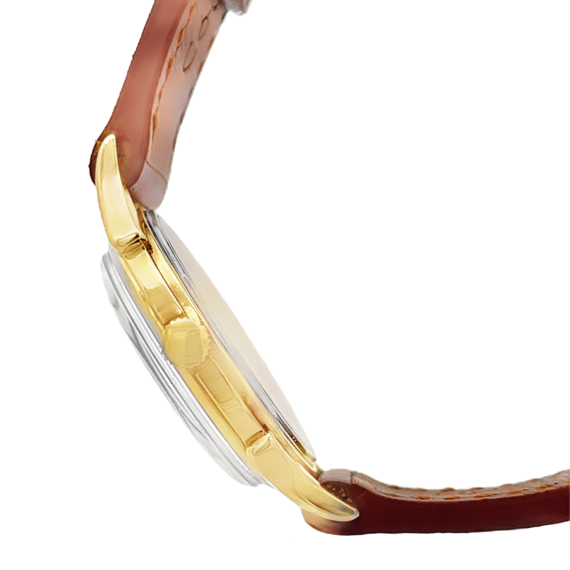 • Strap / Buckle: Classic brown leather strap, 18 mm width, yellow-tone buckle