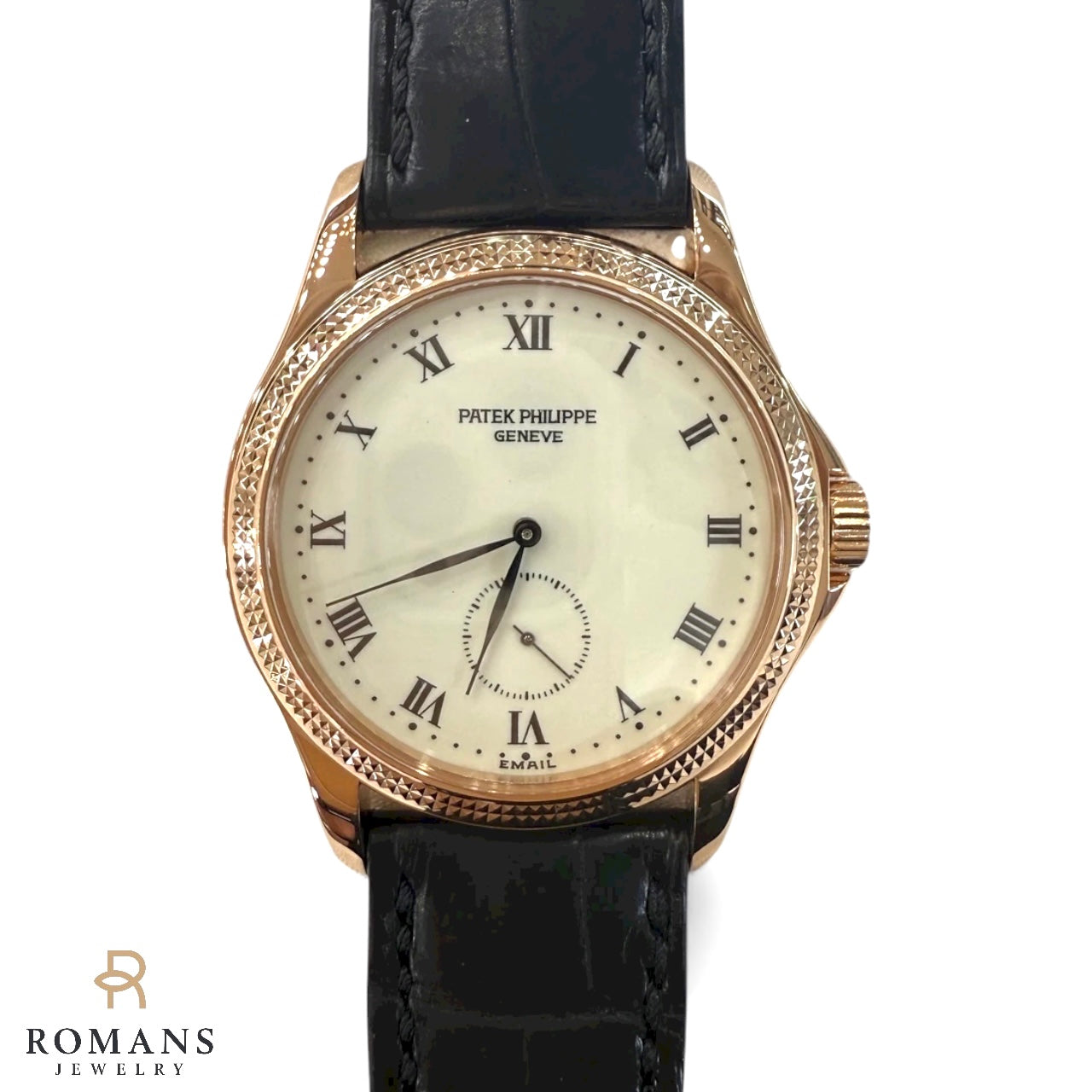 Luxurious and refined, this exquisite Patek Philippe Calatrava in 18K rose gold is a timeless masterpiece of horological craftsmanship. Its elegant 35mm case showcases the classic Calatrava aesthetic with refined detailing and a slim profile. The off-white enamel dial is adorned with crisp Roman numerals and a sub-seconds register at 6 o’clock.