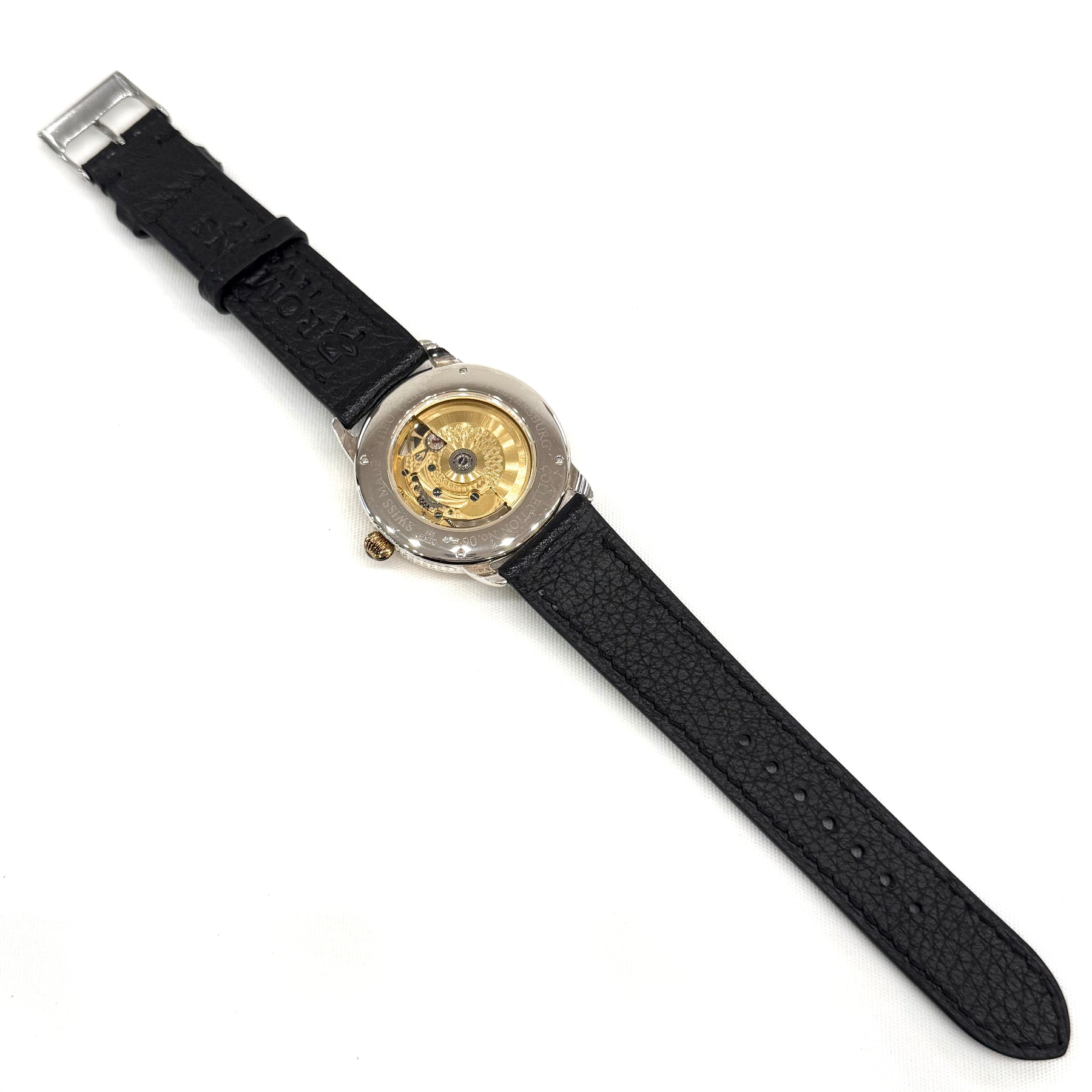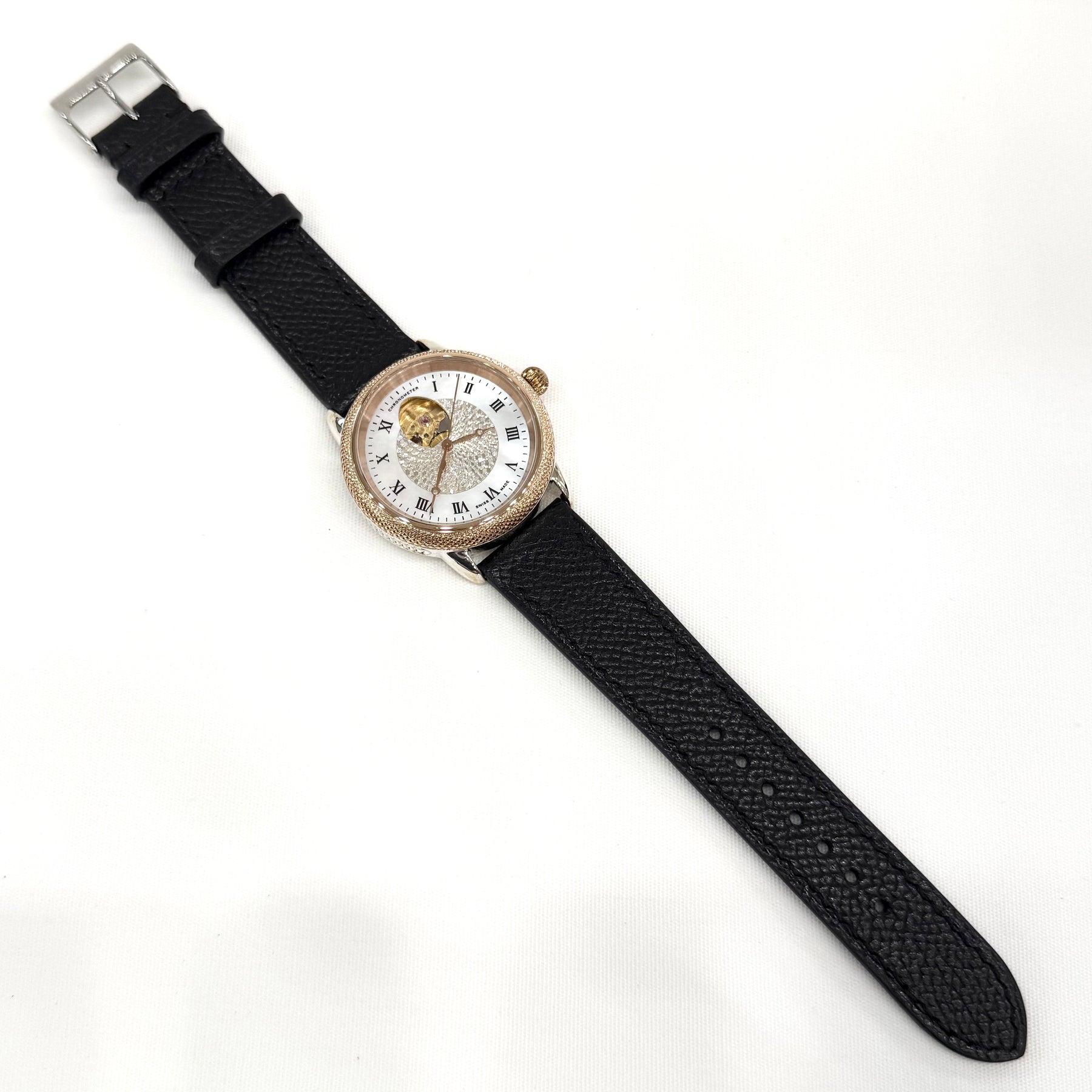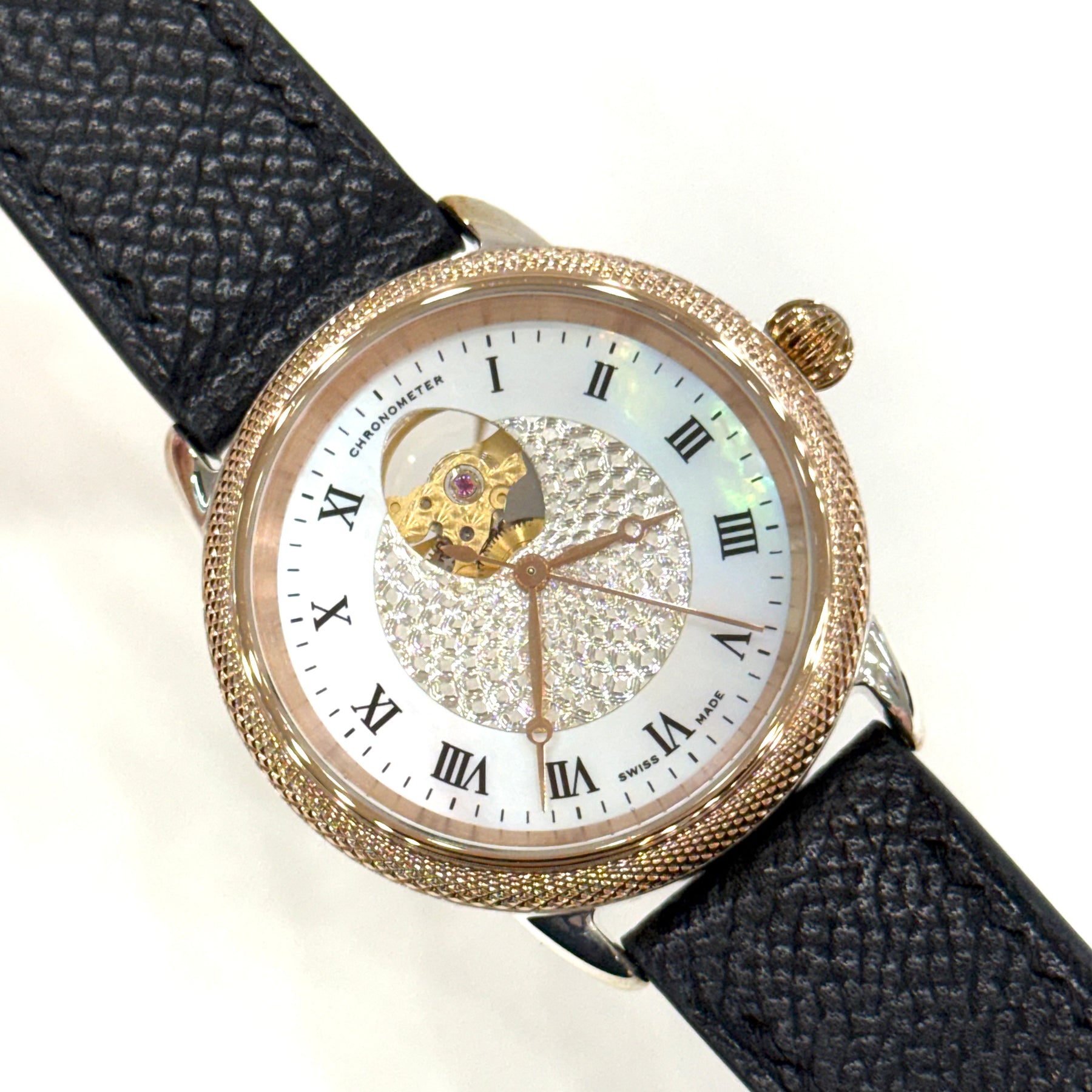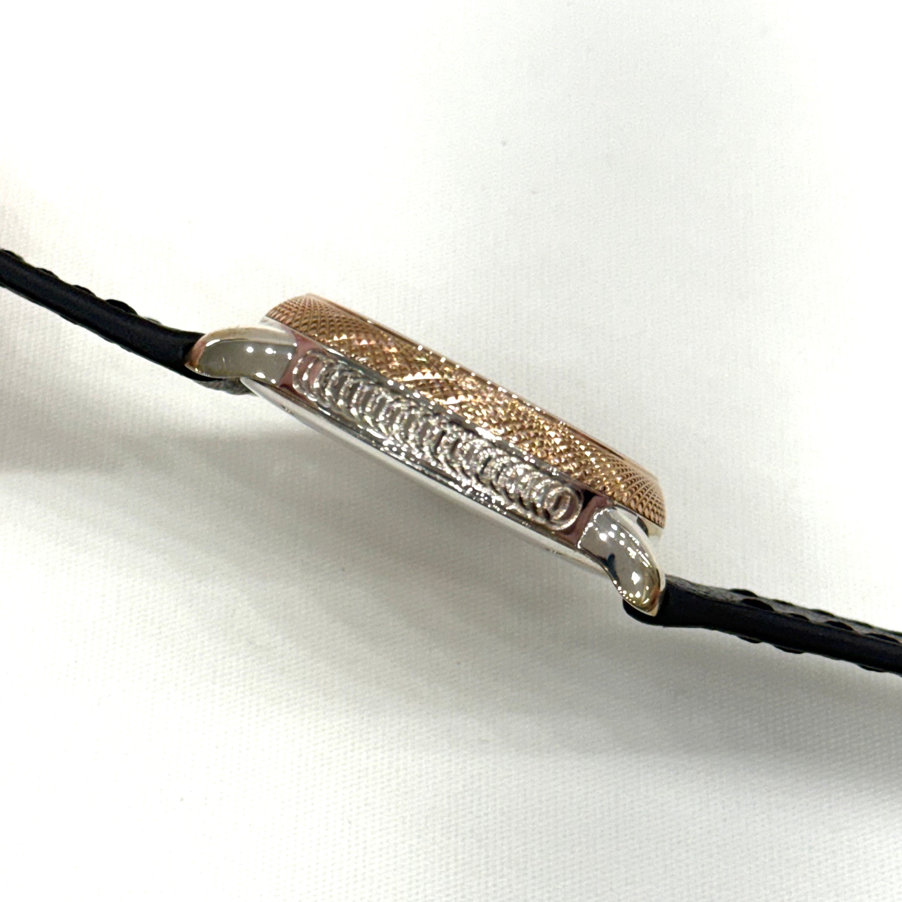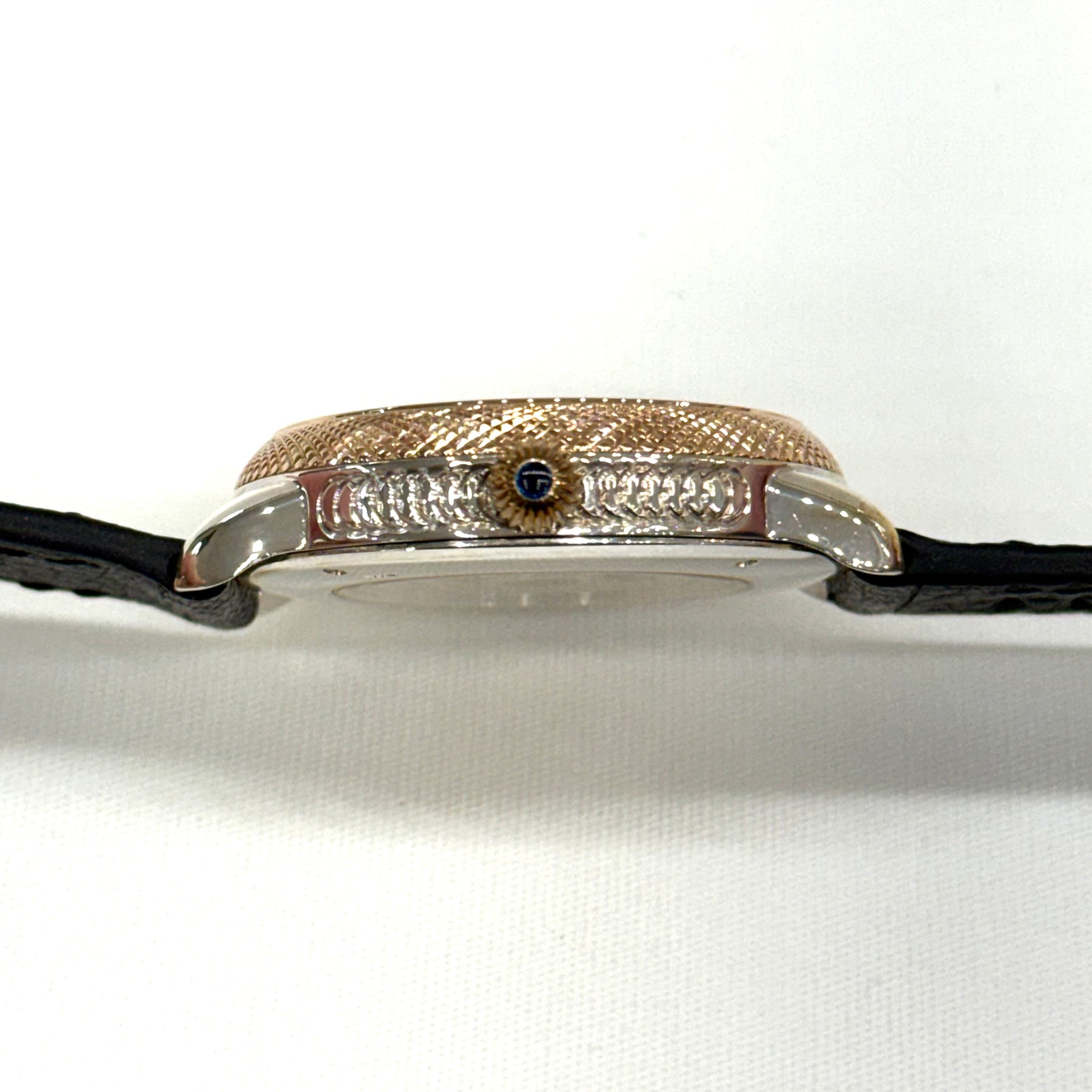 Extremely rare Theo Fabergé St. Petersburg Collection wristwatch No. 6 of only 25 made worldwide. This museum-level timepiece was created in the spirit of the imperial Fabergé tradition and features an 18K rose gold bezel paired with a solid sterling silver case for a rich two-tone look. The dial is classic Theo Fabergé: off-center engine-turned pattern, mother-of-pearl chapter dial with Roman numerals, and at 12 o’clock the signature Fabergé egg-shaped aperture revealing the beating balance the hallmark detail of these St. Petersburg watches. Powered by a Swiss automatic 25-jewel chronometer movement, recently serviced and running properly, and backed by our 2-year Romans Jewelry warranty. Comes complete with the original St. Petersburg Collection presentation egg, fitted box, and paperwork an exceptionally hard set to find.