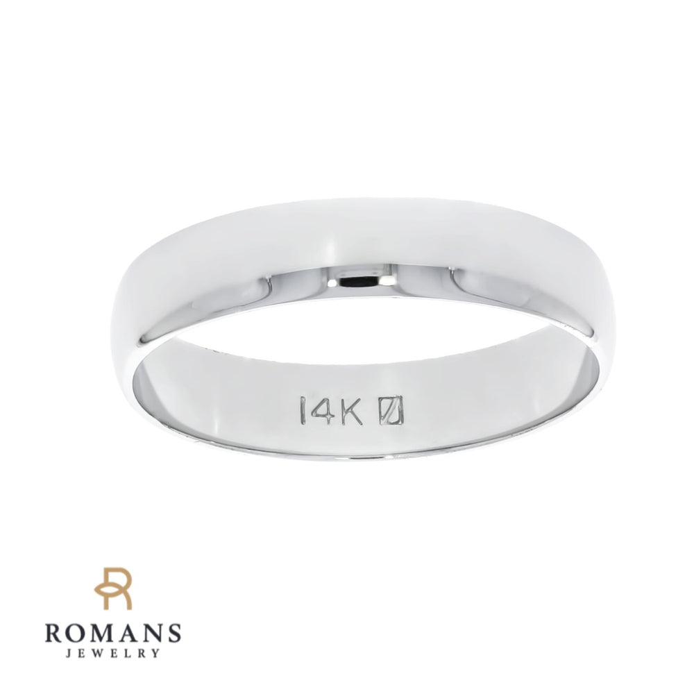 This classic 4mm half-round 14k white gold wedding band has a flat inside edge for increased comfort. Wear it on its own, match it to your engagement ring, or stack it with other stackable rings.