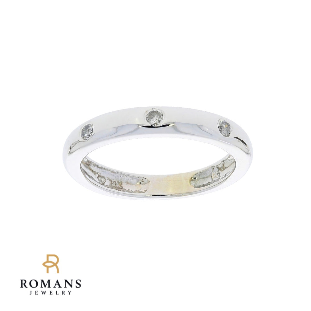 This exquisite ring embodies the spontaneity of love with a constellation of periodically placed diamond accents on a lustrous precious 14k white gold band.