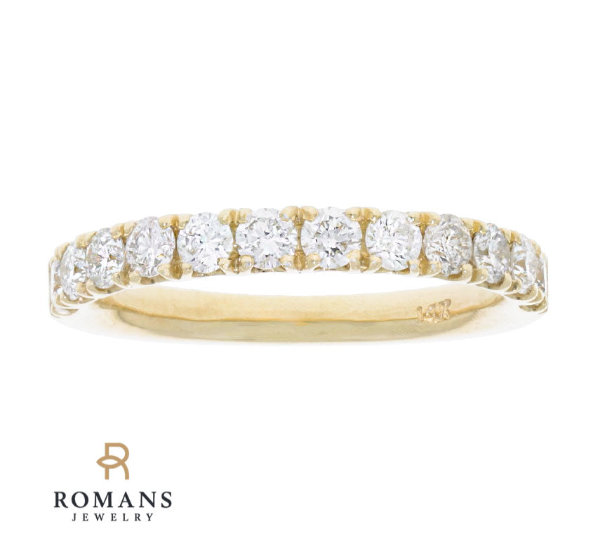 Crafted from 14k yellow gold, this diamond ring is a style essential. A row of sparkling round brilliant diamonds shimmers brightly halfway down the shank. Perfect wedding band to match any engagement ring. Diamonds 0.50 carat weight, SI clarity GHI color.