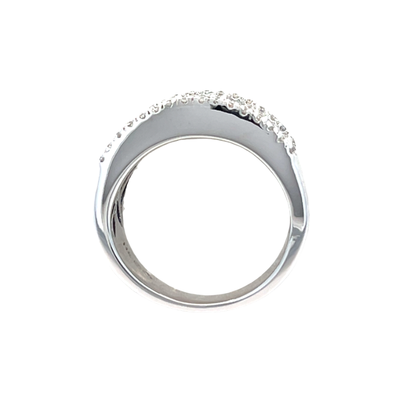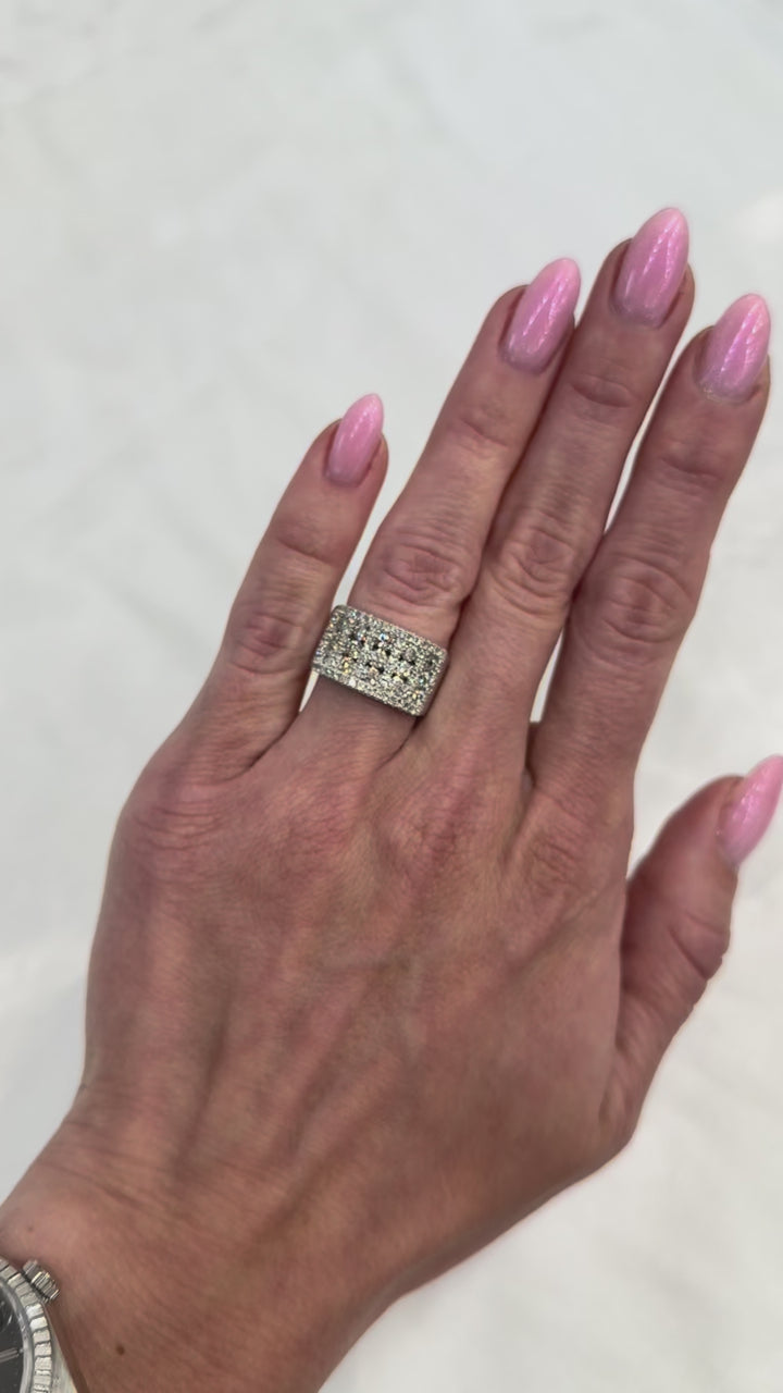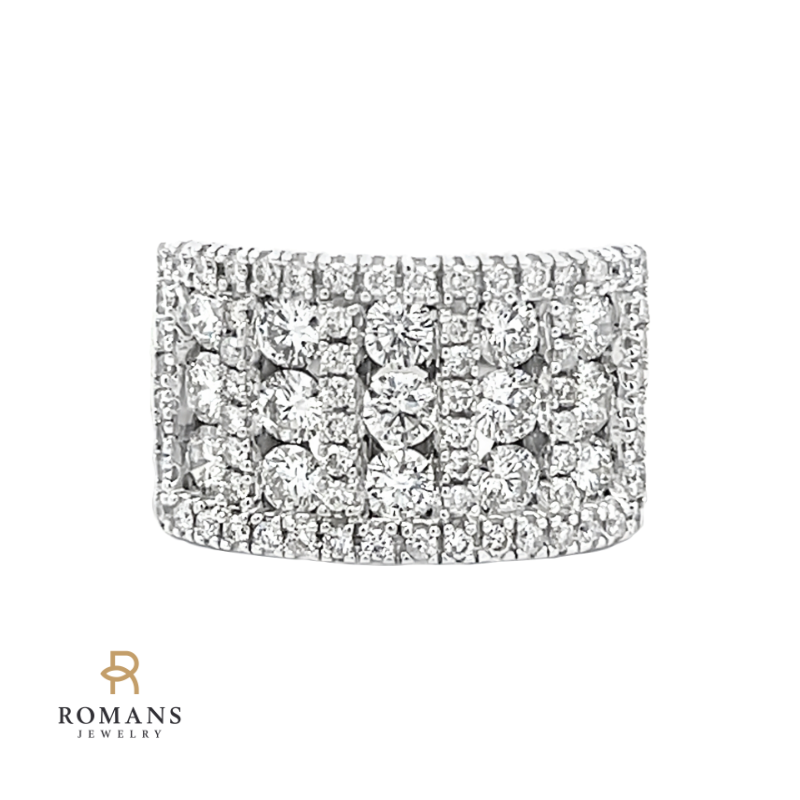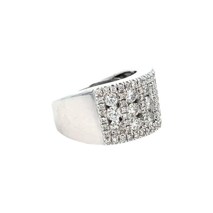This stunning ring showcases a bold cluster of sparkling round diamonds set in polished 14K white gold. Its wide design and brilliant shine make it a perfect statement piece for any occasion. Elegant, timeless, and crafted to catch the light from every angle.