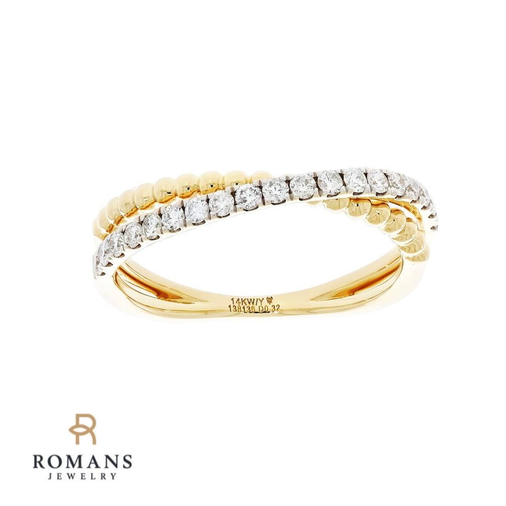 Crafted from 14k yellow & white gold, this diamond ring is a style essential. A row of sparkling round brilliant diamonds shimmer brightly half way down crossing over bead style band giving the ring a perfect crossover look. Perfect wedding band to match any engagement ring.