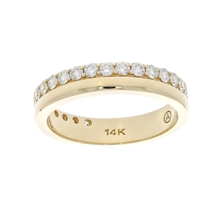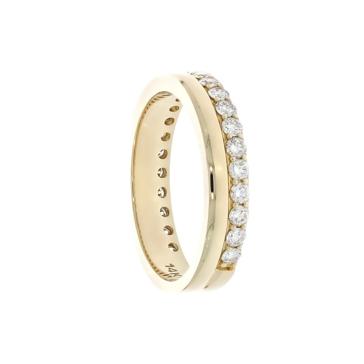 Crafted from 14k yellow gold, this two row ring is a style essential. A row of sparkling round brilliant diamonds shimmers brightly 3/4th way down the shank stacked with a simple band creating the perfect stack with the illusion of two rings.